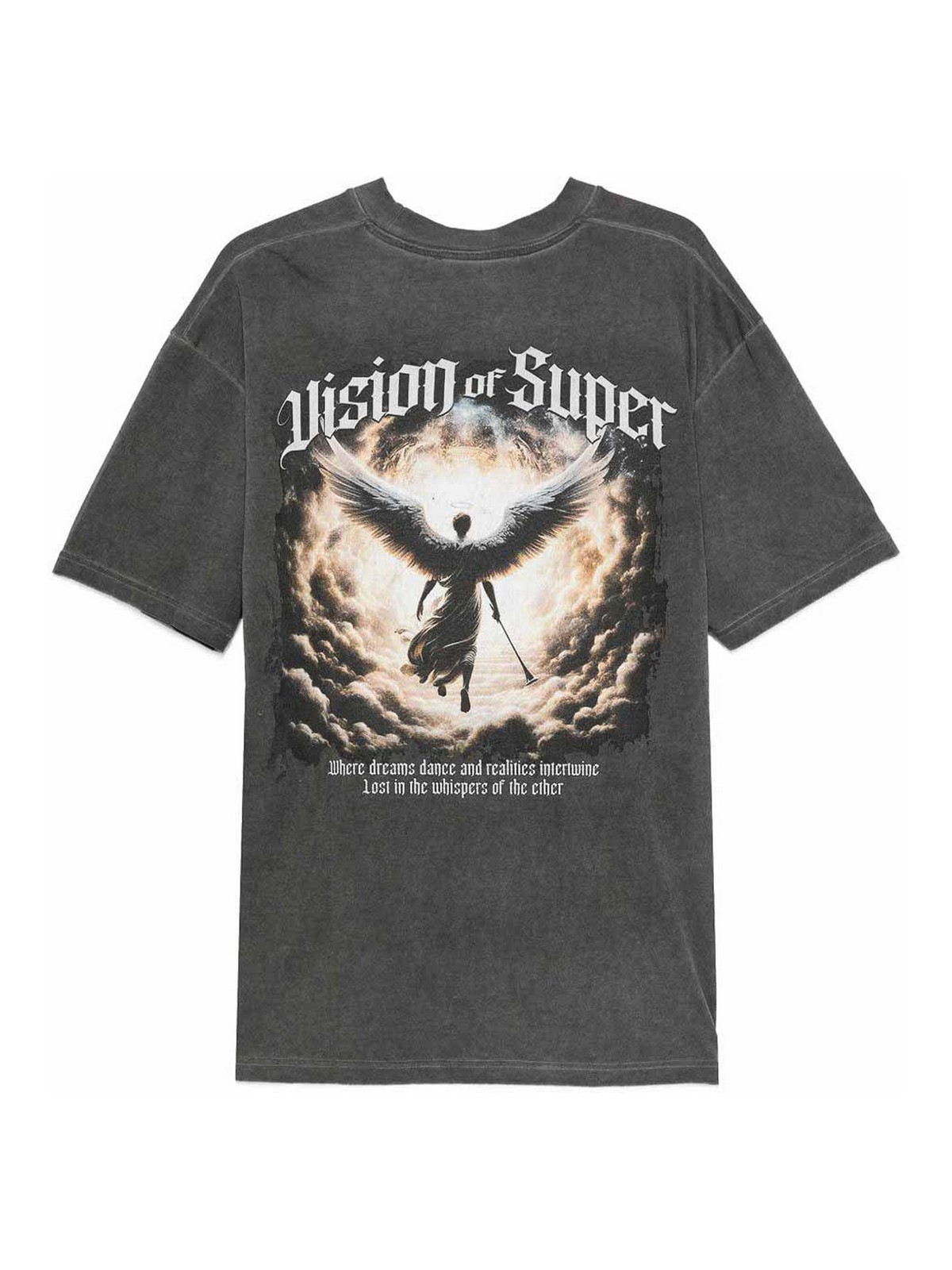 T-shirt grigia di vision of super caratterizzata da girocollo e maniche corte dettagliate con una stampa grafica sul retro per un look streetwear moderno