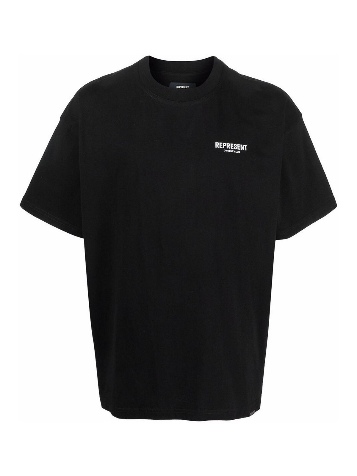 T-shirt in cotone con stampa logo in cotone nero di rappresentare con stampa del logo a girocollo sul petto, stampa del logo a maniche corte sul retro e orlo dritto