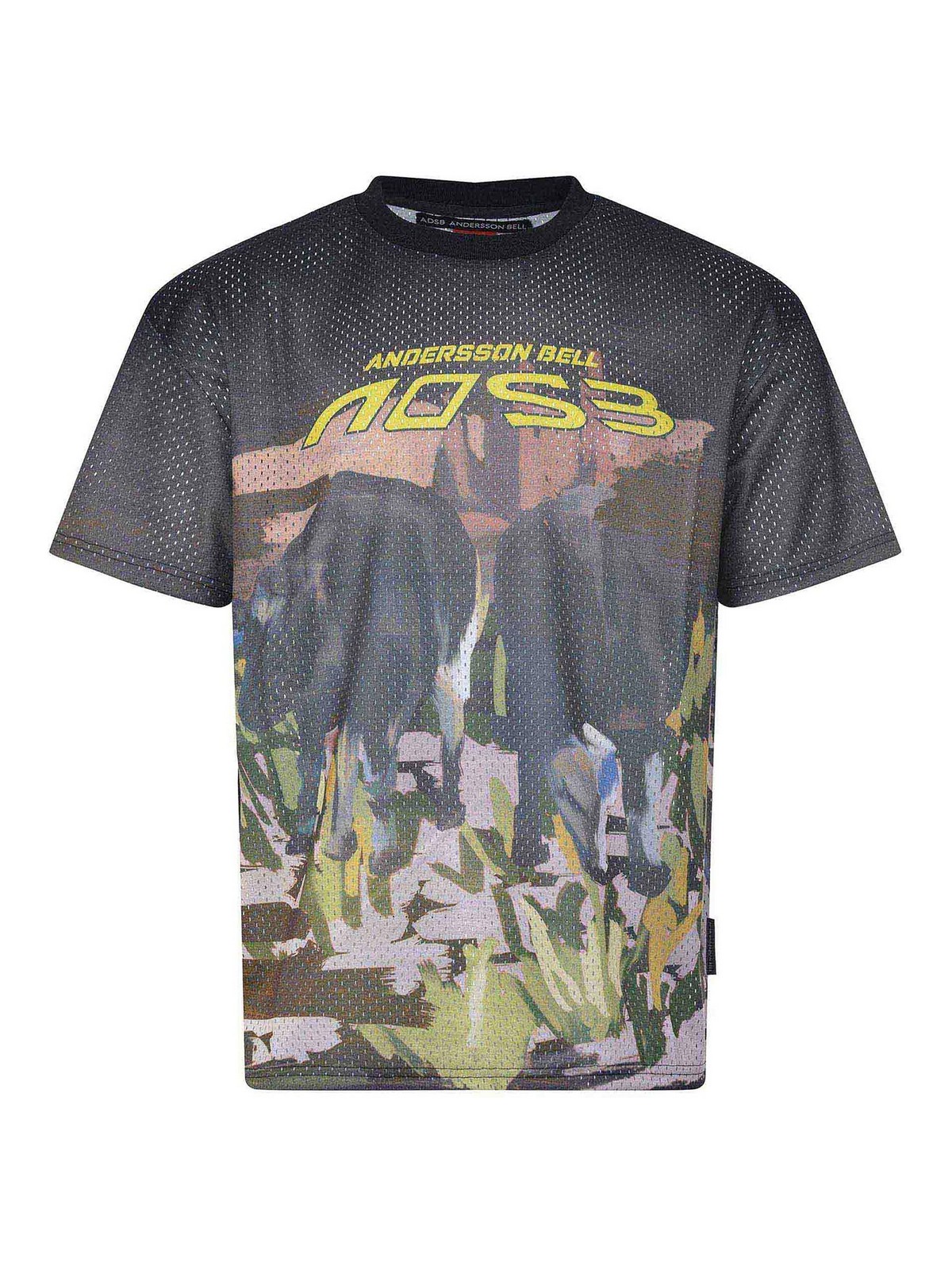 T-shirt di Andersson Bell a campana completamente perforata a maniche corte a coste del collo in contrasto in contrasto con le lettere sul petto contrastano le stampe sul retro e sul retro