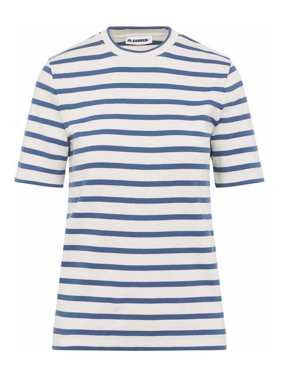 T-shirt Jil Sander in cotone di seta di mais. T-shirt in puro cotone cornsilk, girocollo, fondo in cornsilk con righe nautiche all-over, lavorazione a costine all-over, maniche corte, fondo dritto.