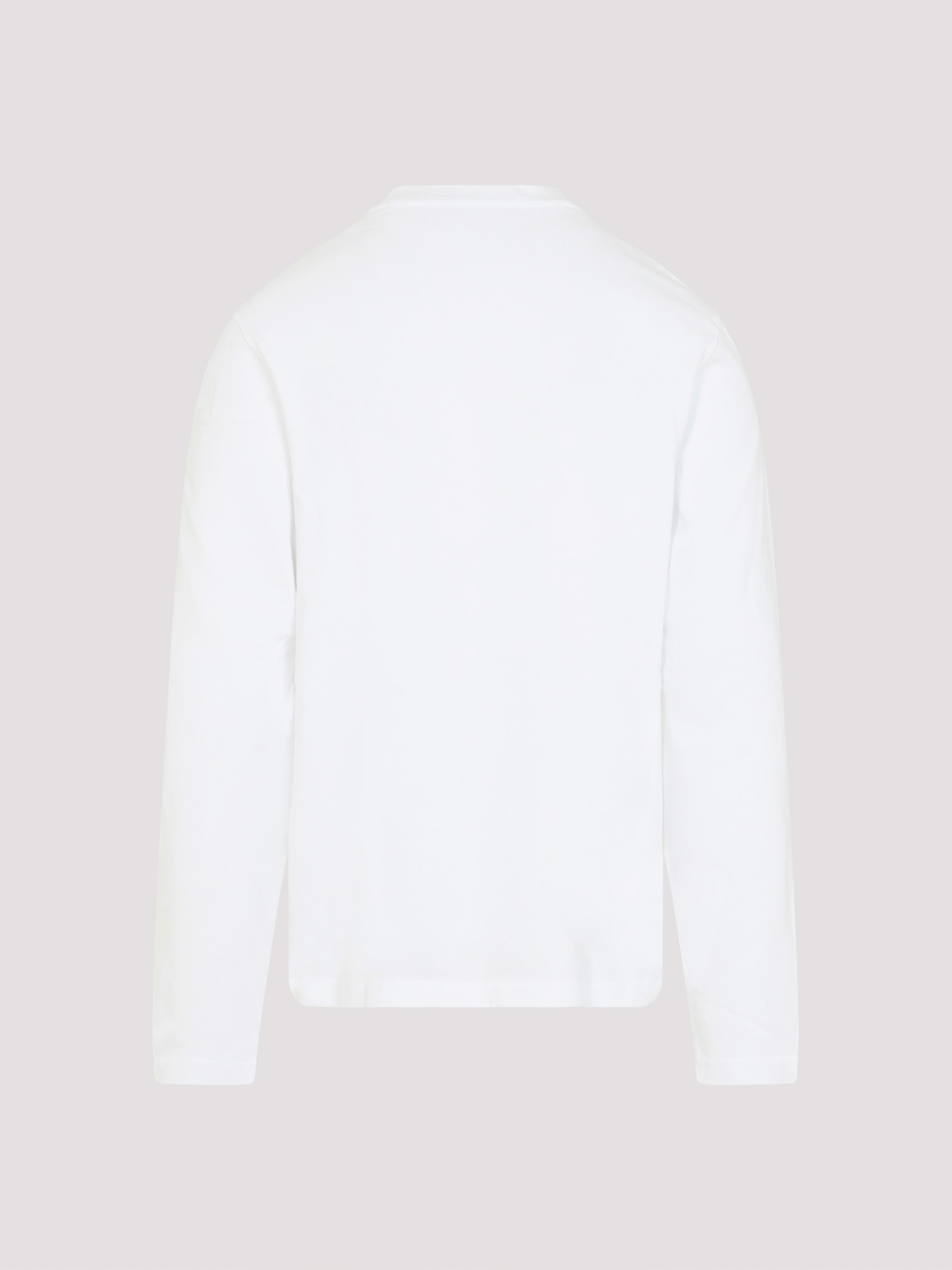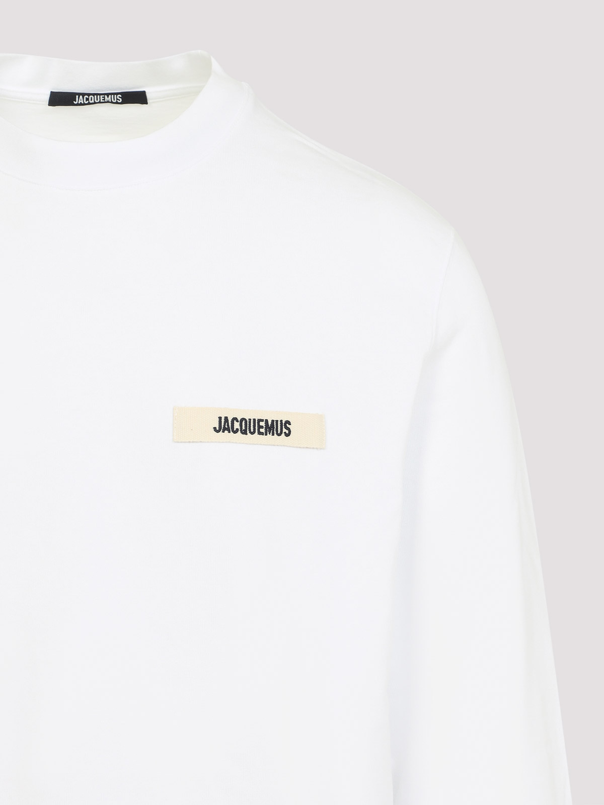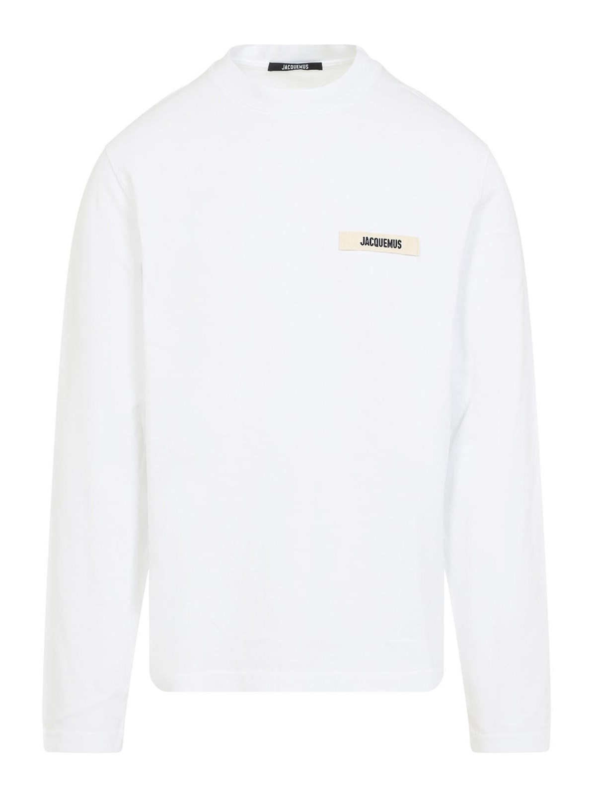 T-shirt di cotone bianco Jacquemus Le Grosgrain. Realizzato in maglia di cotone bianco, scollatura a coste rotonde, grosgrain con ricamo logo sul petto, maniche lunghe, orlo dritto, vestibilità rilassata.