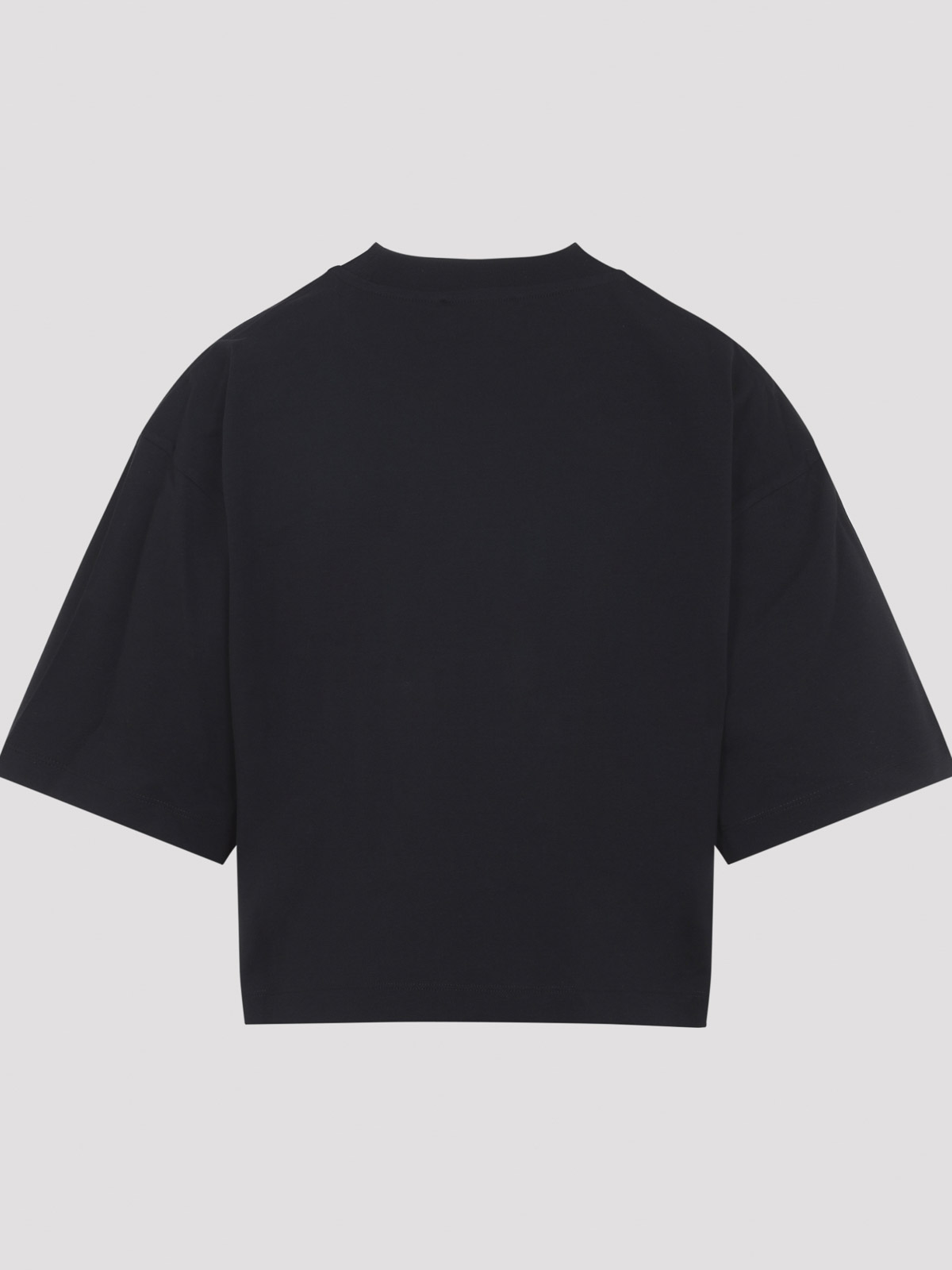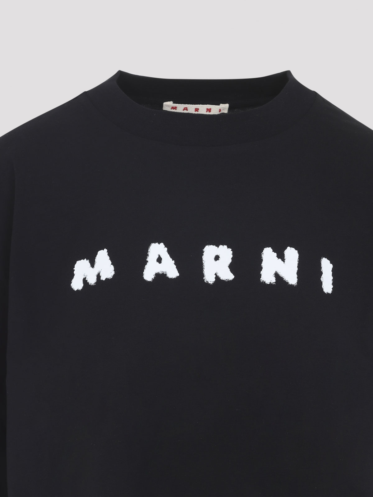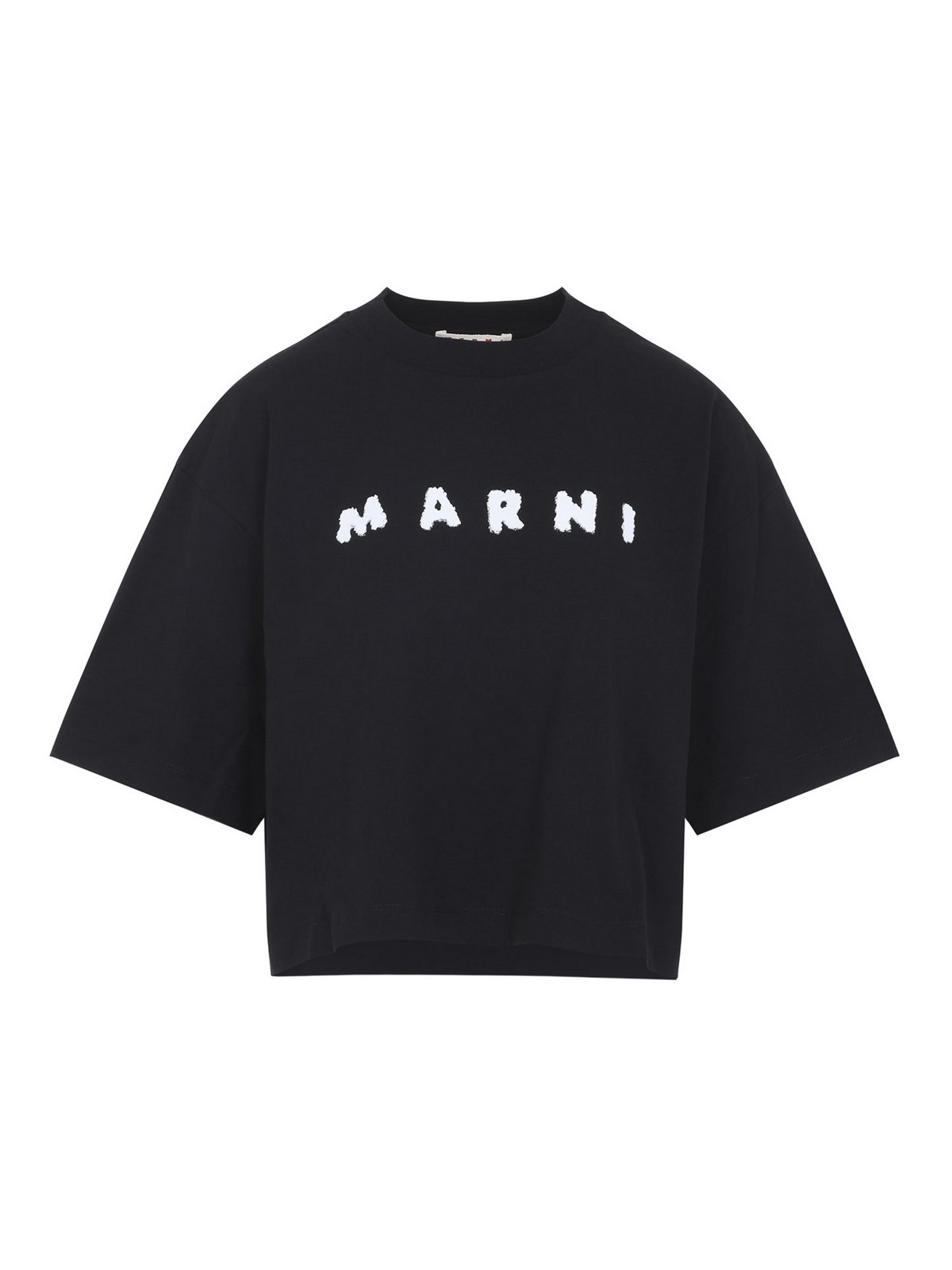 T-shirt Marni in cotone nero. T-shirt in puro cotone nero, girocollo, logo lettering bianco frontale a contrasto, maniche corte, fondo dritto.