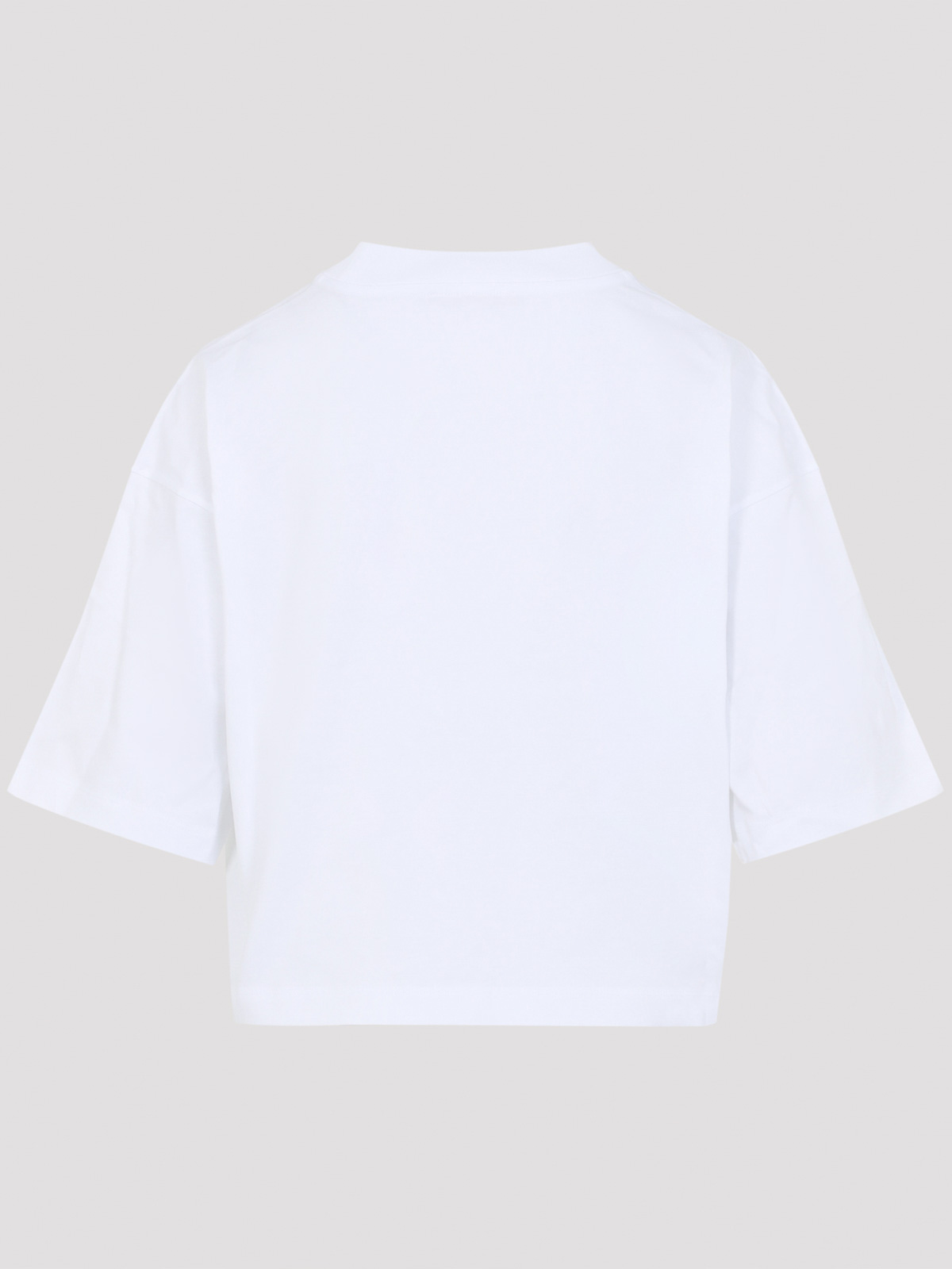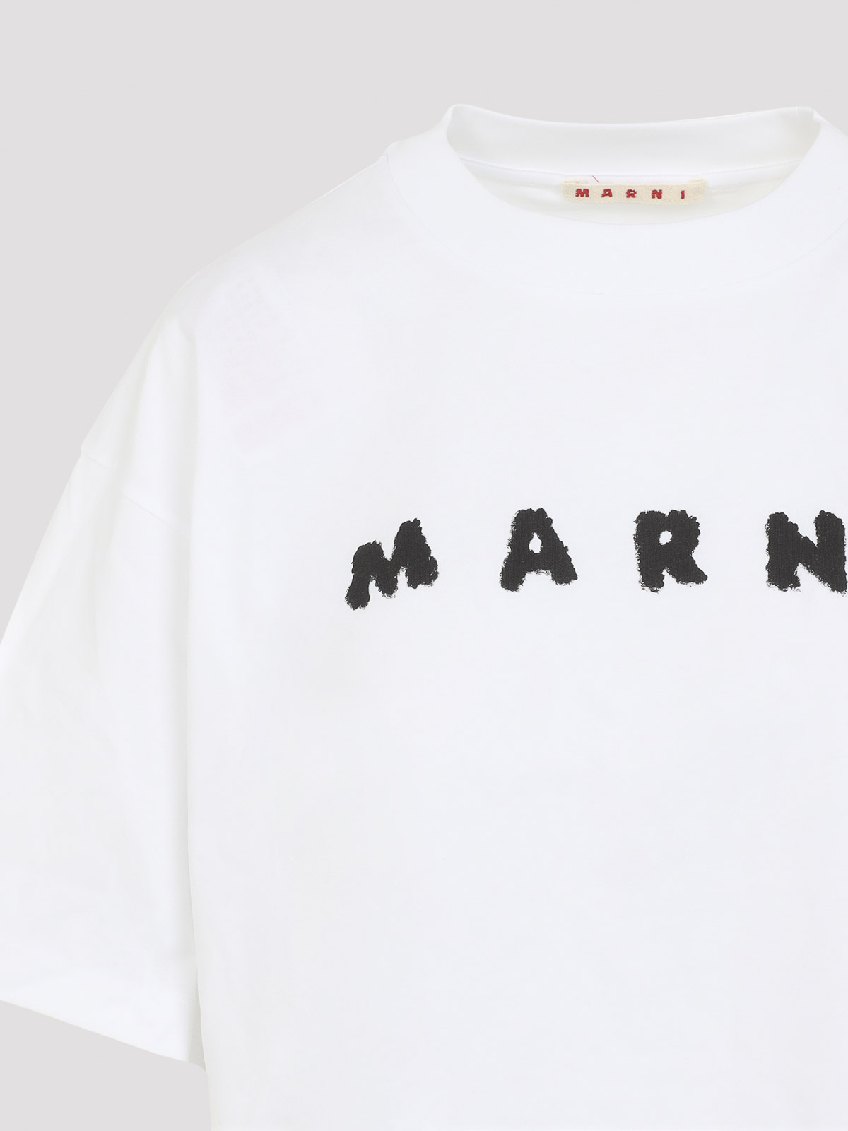 T-shirt Marni giglio in cotone bianco. T-shirt in puro cotone bianco giglio, girocollo, logo lettering nero frontale a contrasto, maniche corte, fondo dritto.