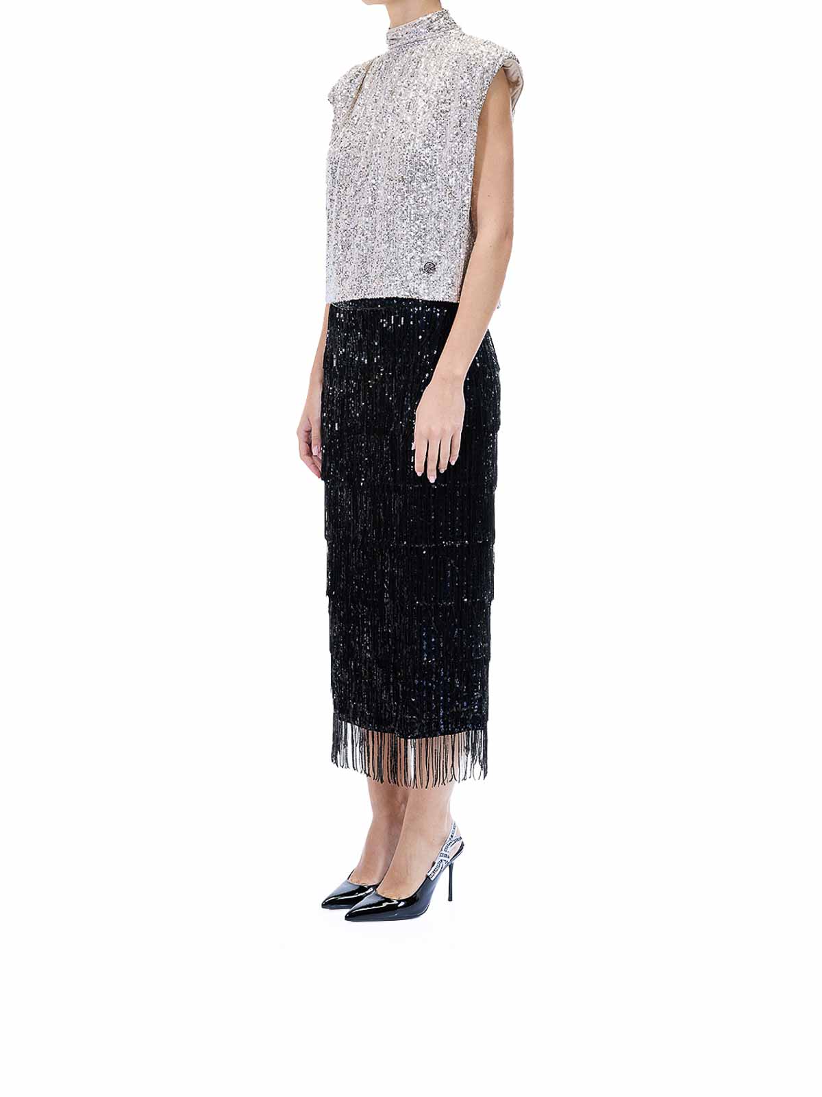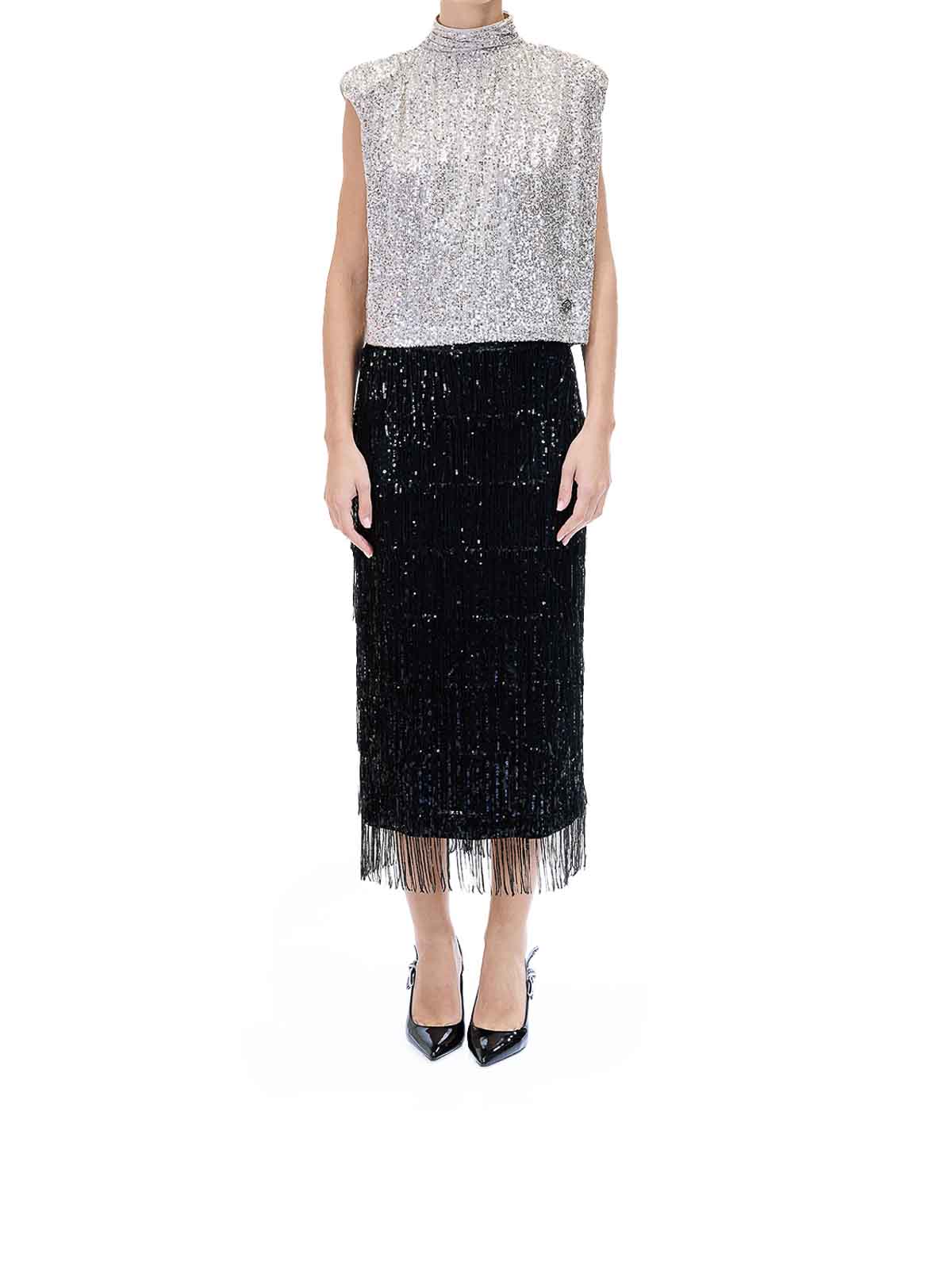 Sequins party top in oro. top senza maniche di karl lagerfeld con applicazioni in pailettes all-over e collo a lupetto. rifinito con spalle imbottite e dettaglio in galvanica con la karl signature sull'orlo. senza maniche, collo a lupetto, applicazioni in pailettes, spalle imbottite, chiusura ad ochiello sul retro, logo in galvanica sull'orlo.