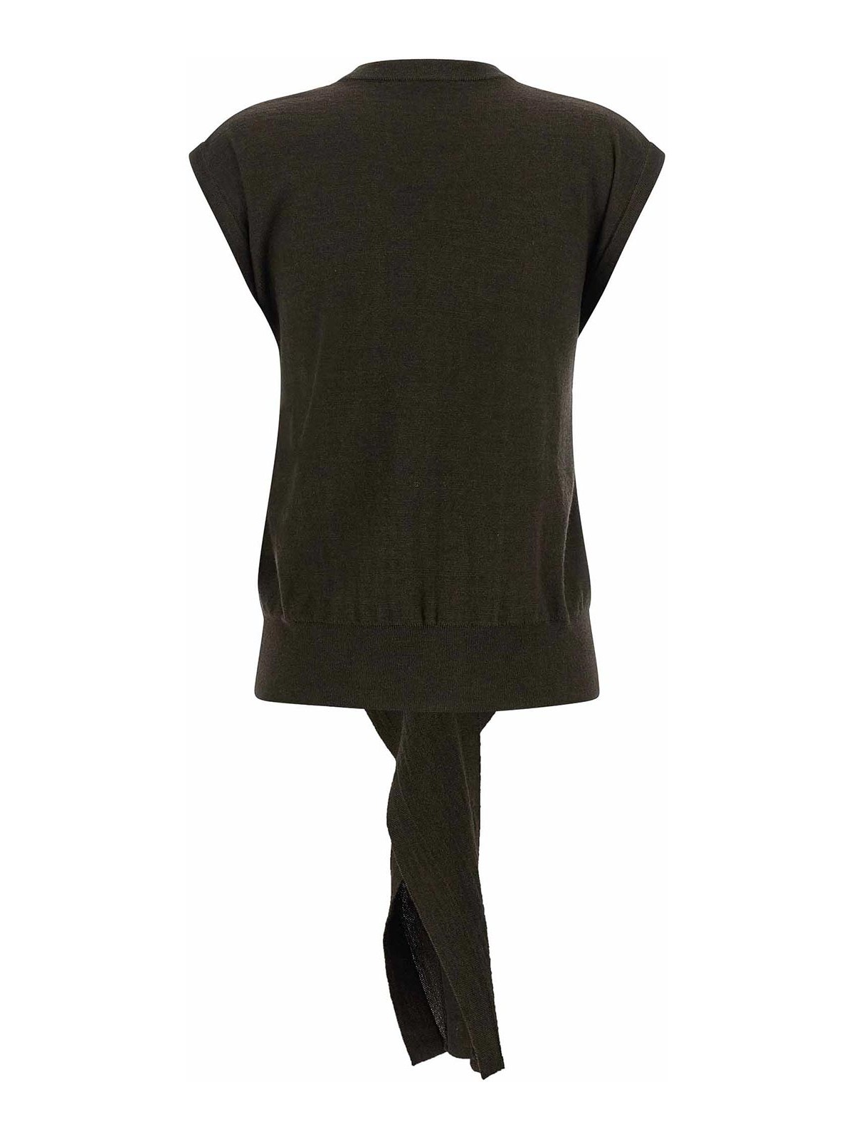 Top lavorato a maglia in misto lana merino, girocollo, con pannelli laterali che presentano bottoni da un lato e occhielli dall'altro, che permettono di annodarlo o annodarlo.