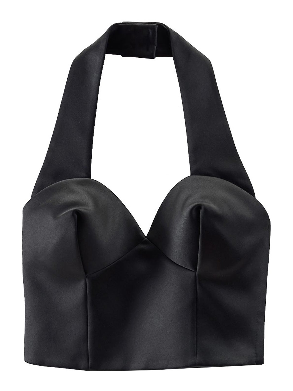 Sculpted satin halter top in nero. top halter di marc jacobs in raso, caratterizzato da una silhouette scolpita sul seno e lo scollo a cuore. tagio corto, collo halter, scollo a cuore, dettaglio scolpito sul seno, chiusura con zip sul retro.