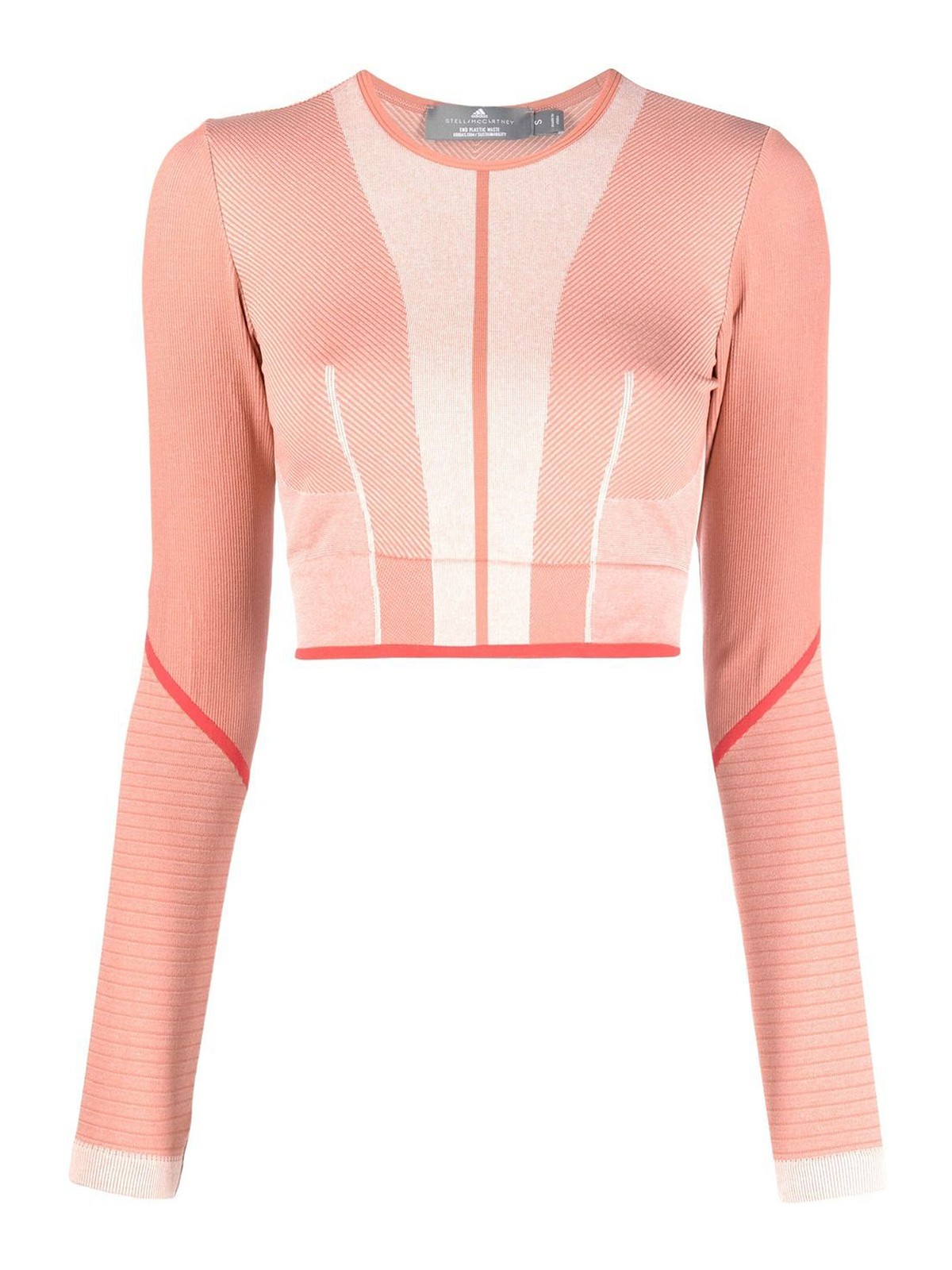Crop top a maniche lunghe senza cuciture rosa corallo, misto poliestere riciclato, stampa del logo sul retro, senza cuciture, design elasticizzato, taglio corto, girocollo e maniche lunghe
