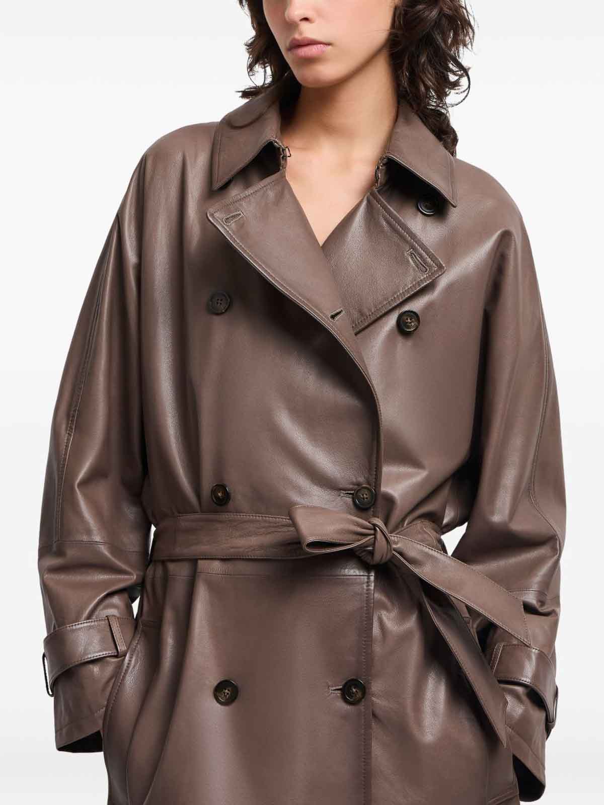 Chiusura doppiopetto marrone con cintura in vita, maniche lunghe, tasche a filetto