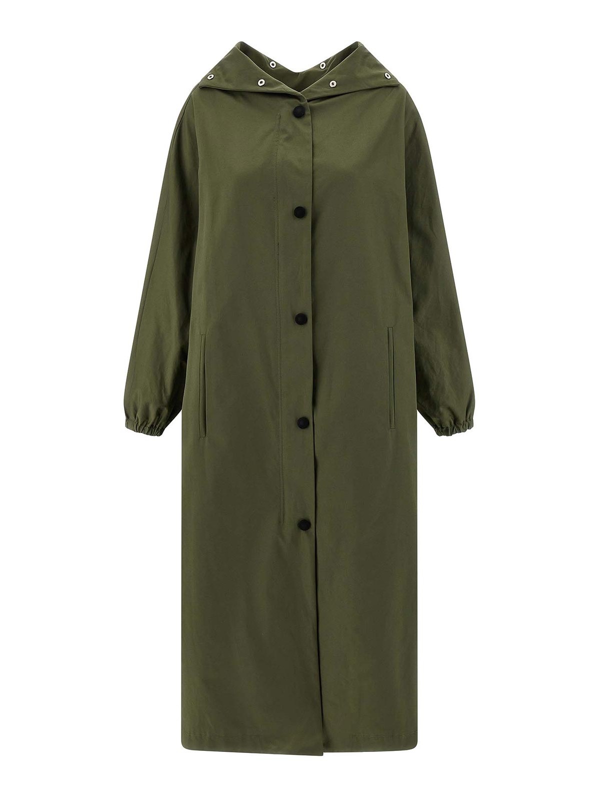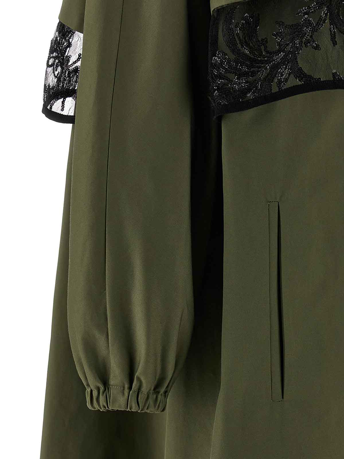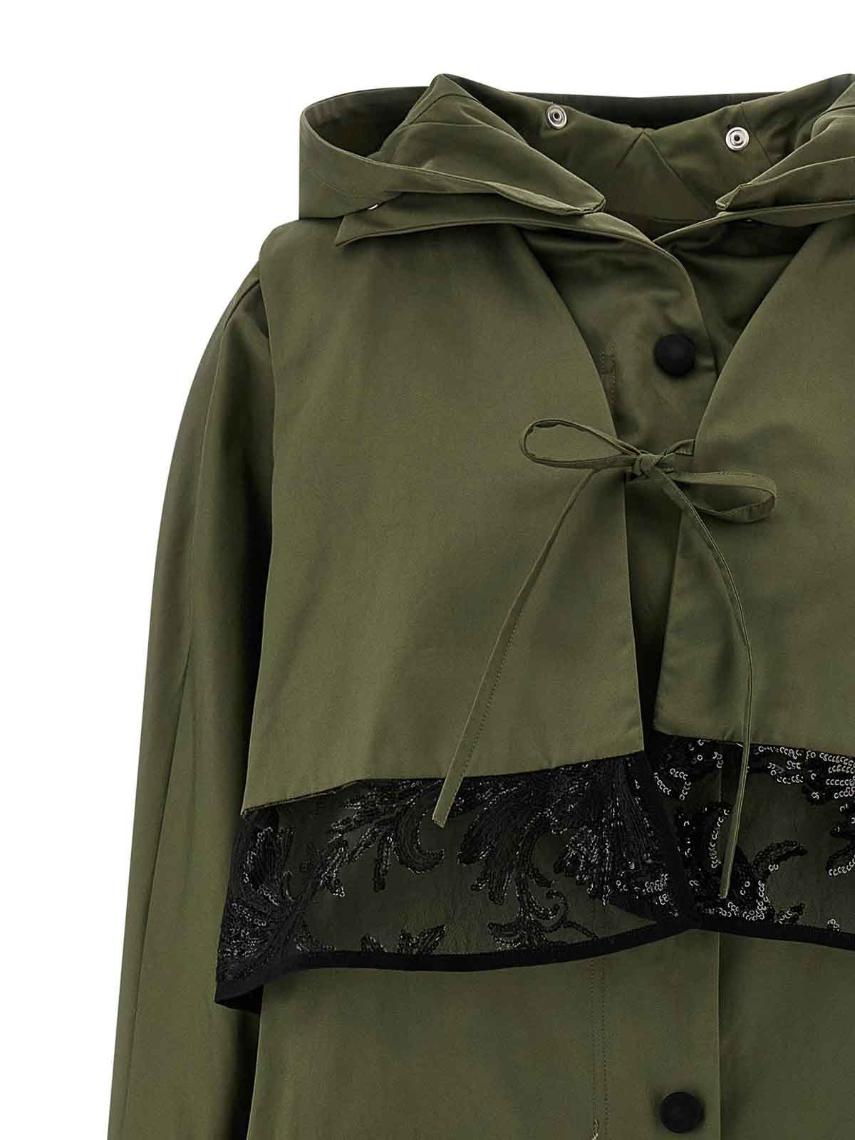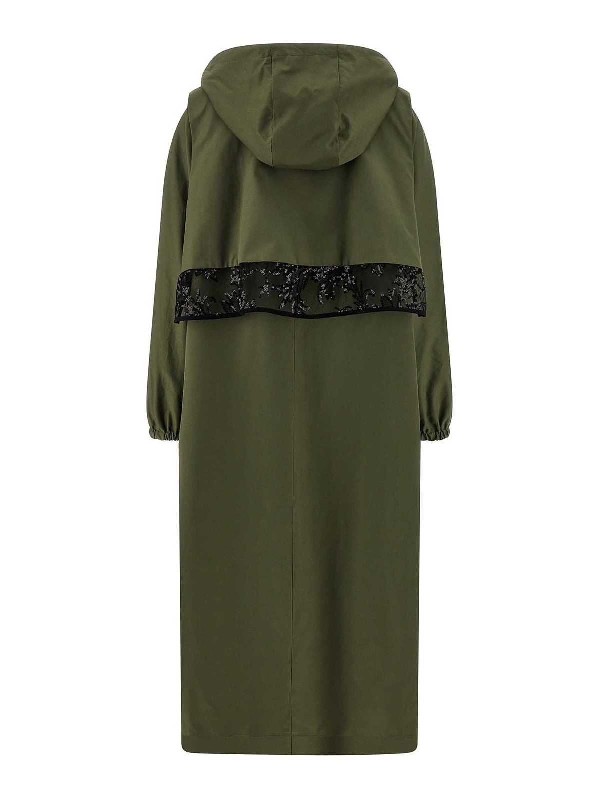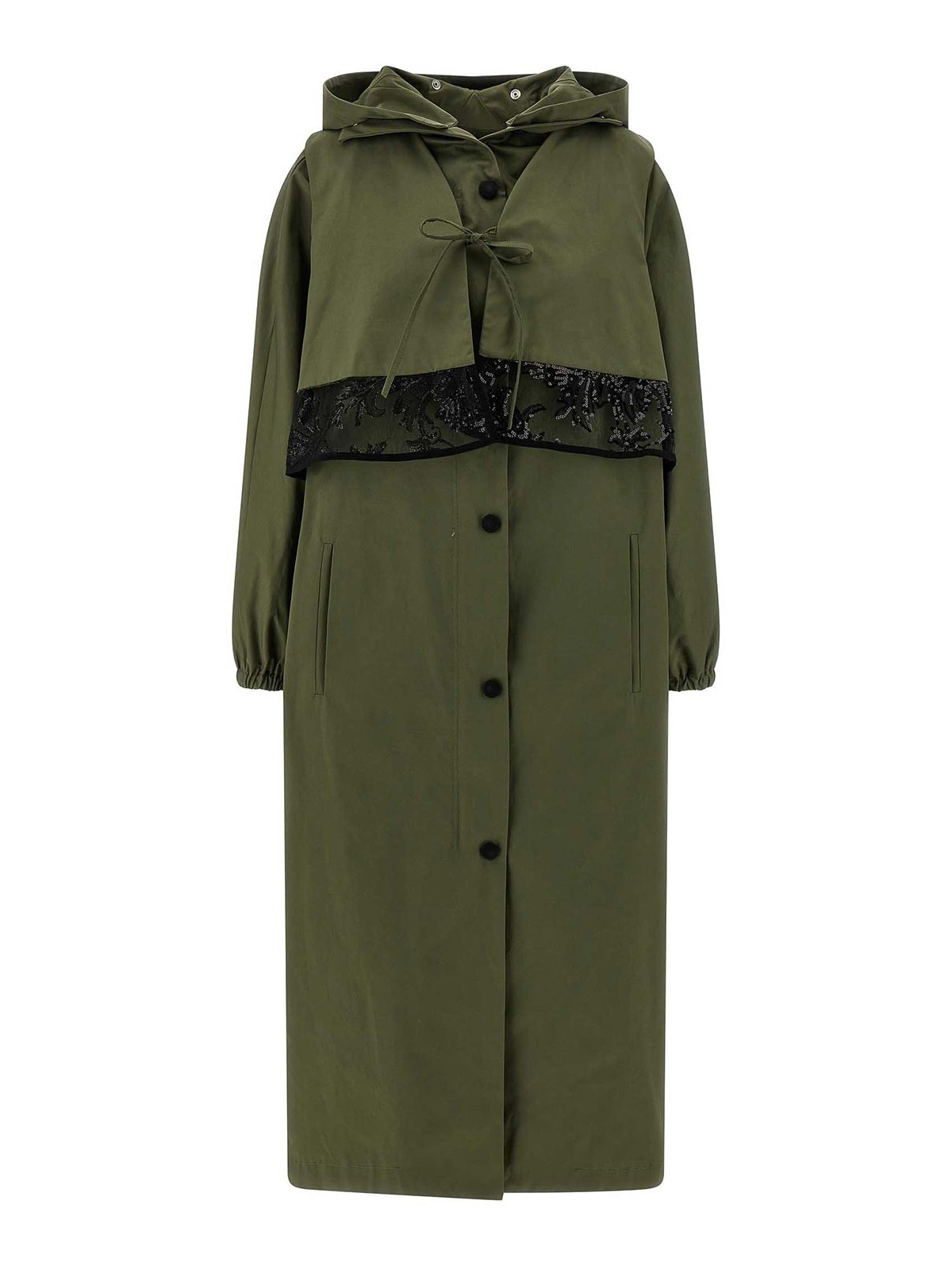 Trench lungo in gabardine di cotone 'incisa', foderato, cappuccio removibile, gilet removibile tono su tono con inserto in pizzo con applicazione di paillettes, chiusura con zip e bottoni automatici frontali, tasche, maniche lunghe ampie con polsini elasticizzati.