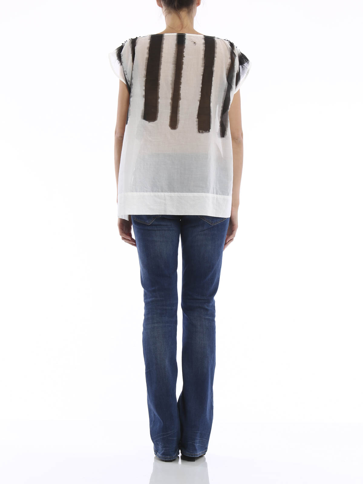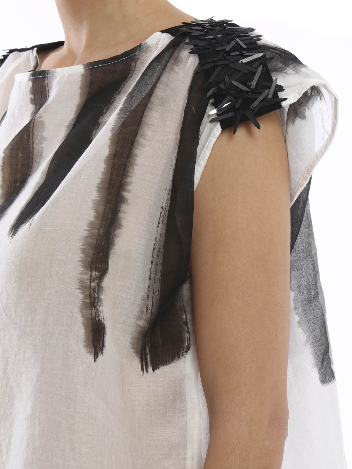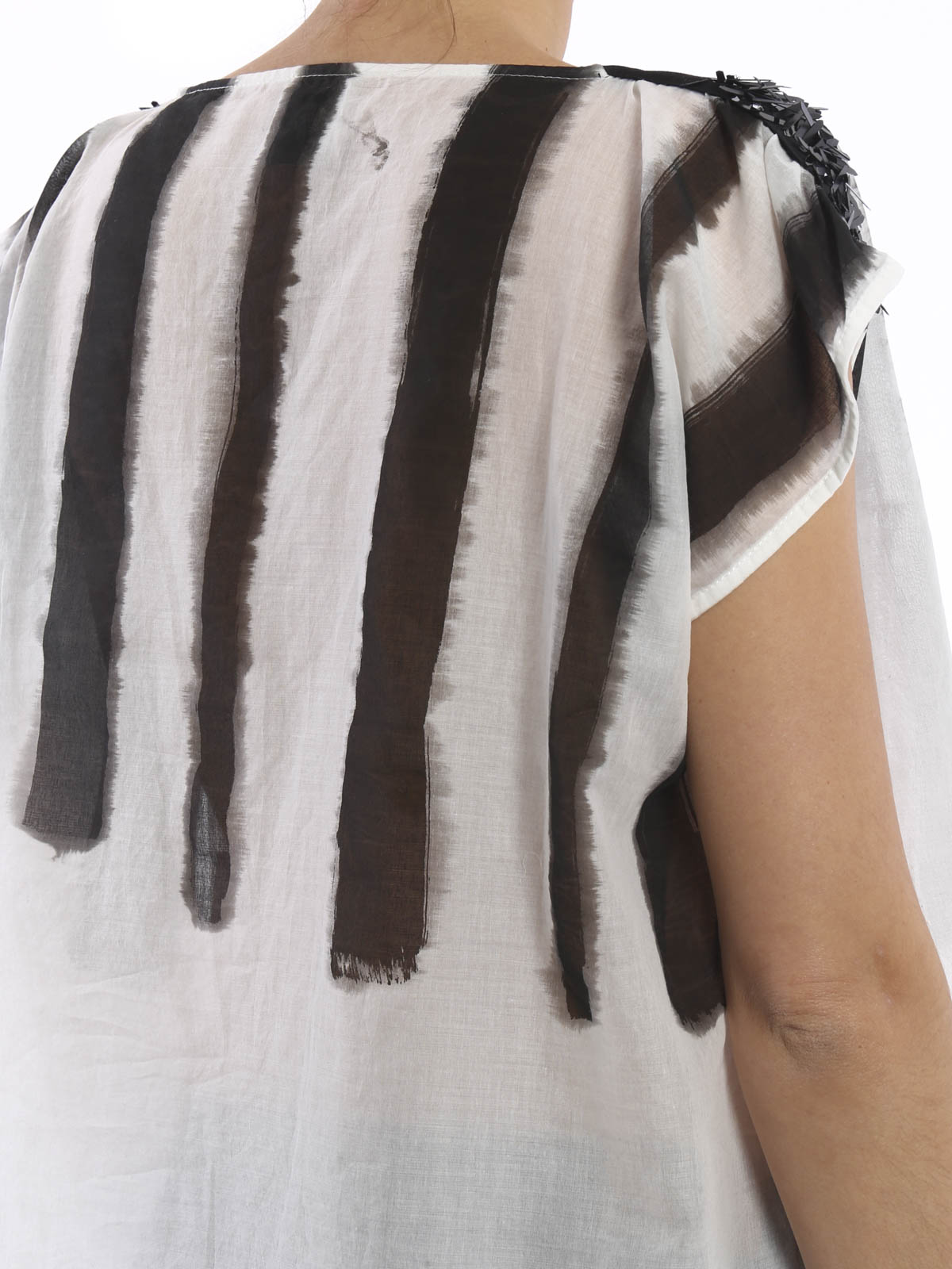 T-shirt larga smanicata in cotone semitrasparente con scollatura a barca, stampa a righe verticali sfumate, bande in grosgrain a contrasto con applicazioni luccicanti sulle spalle e spacchetti laterali.
