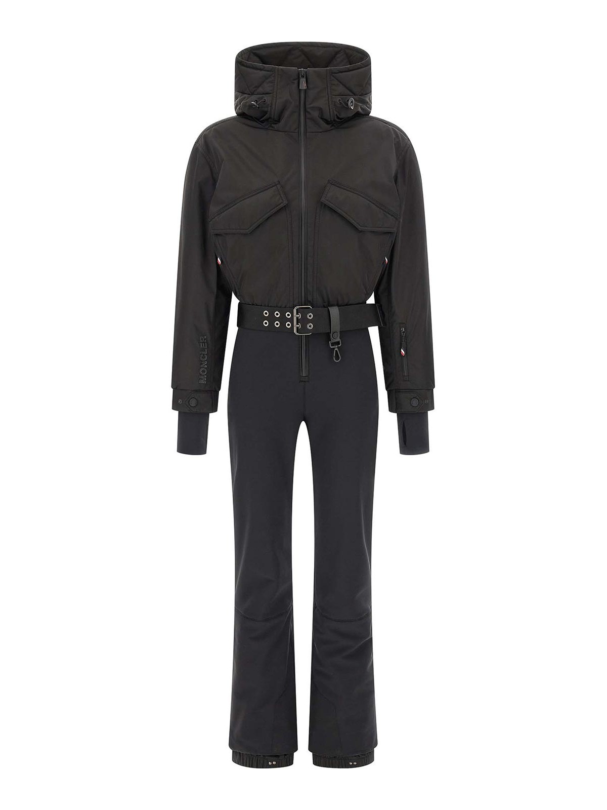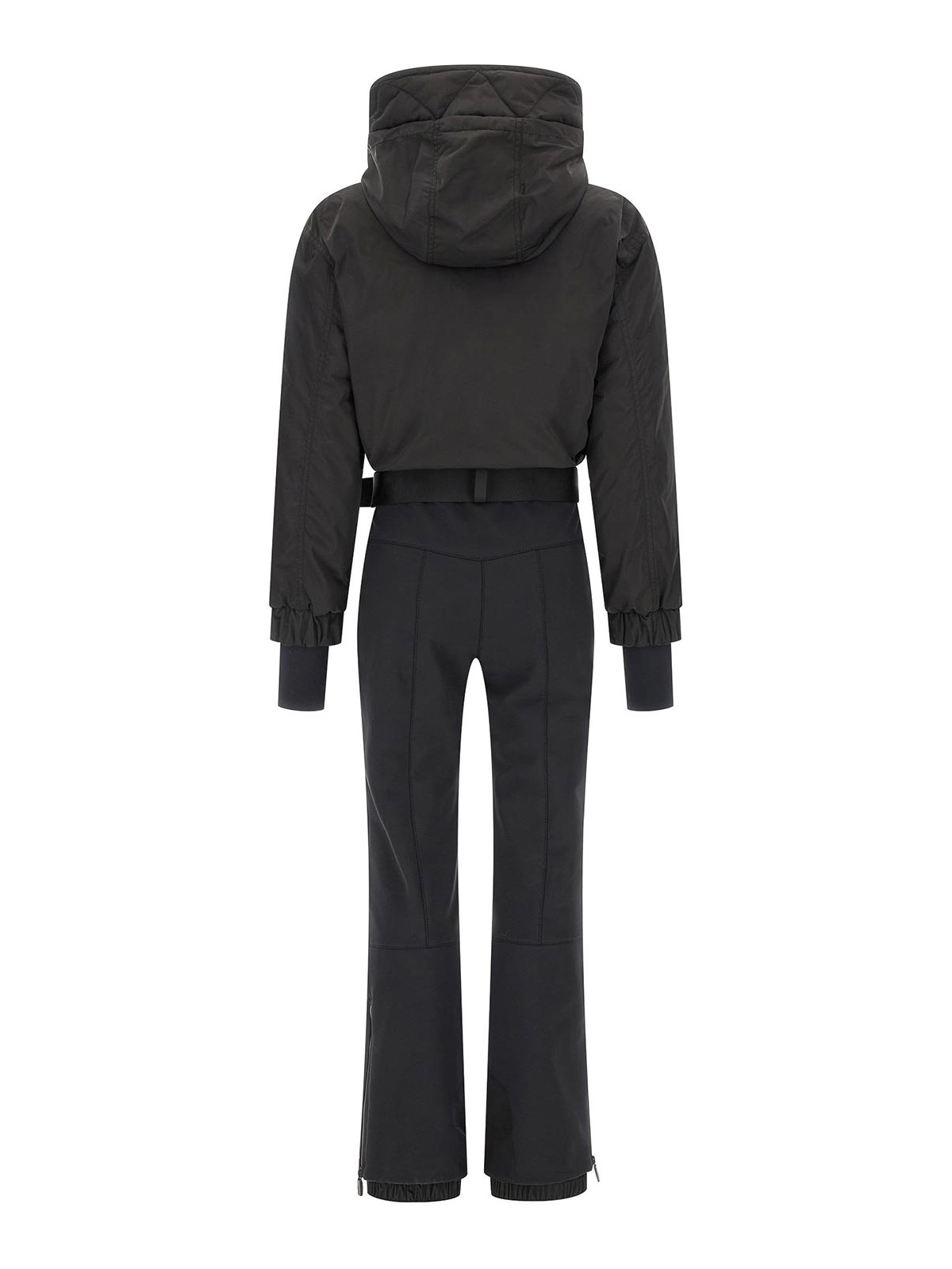 Tuta da sci 'nve' in tessuto tecnico idrorepellente e traspirante con imbottitura in piuma d'oca nella parte superiore, cappuccio regolabile foderato in shearling, collo alto, chiusura frontale con zip, tasche, maniche lunghe con polsini elastici, ghetta antivento e patch logo tono su tono applicato, fodera in pile nelle gambe, fondo gamba svasato con zip, rinforzo laterale e ghetta interna tono su tono, cintura removibile.