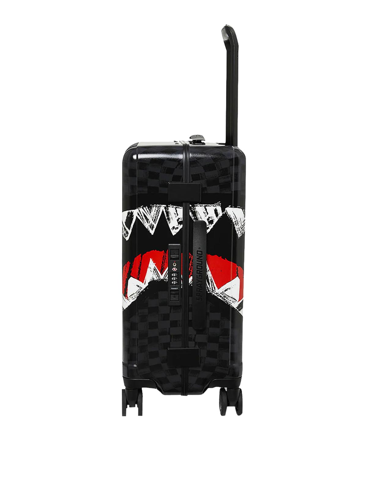 Valigia Sprayground scocca in policarbonato 100% resistente e indistruttibile dimensioni omologate tsa con ruote * chiusure di sicurezza tsa telaio in lega di alluminio senza cerniera 4 ruote doppie piroettanti a scomparsa maniglia telescopica regolabile interno: numerose tasche e scomparti per la massima organizzazione fodera in raso con stampa soldi tasche organizer in rete cinghie di fissaggio cerniere in nylon con accessori in metallo