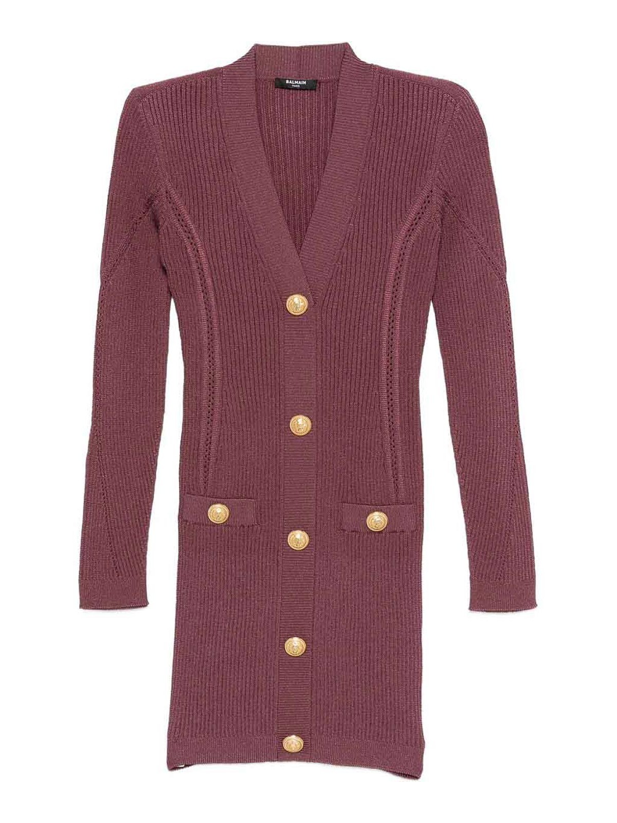 Due tasche con bottone e scollo a V in maglia a coste viola scuro