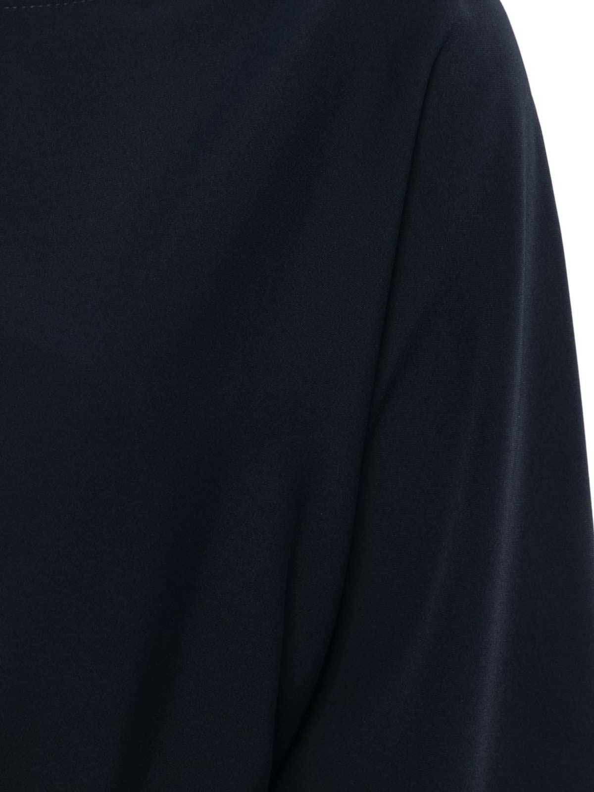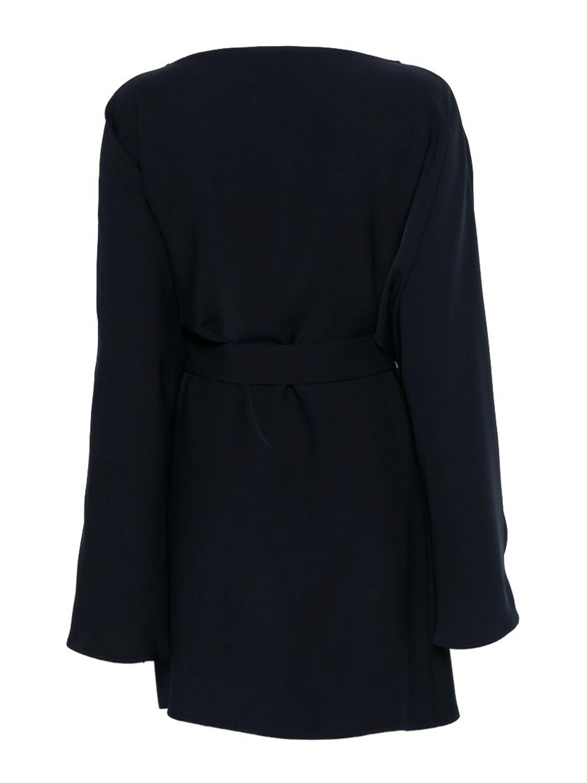 Applicazione ricamata nera con scollo a barchetta, maniche larghe, dettaglio cintura lunga sopra il ginocchio
