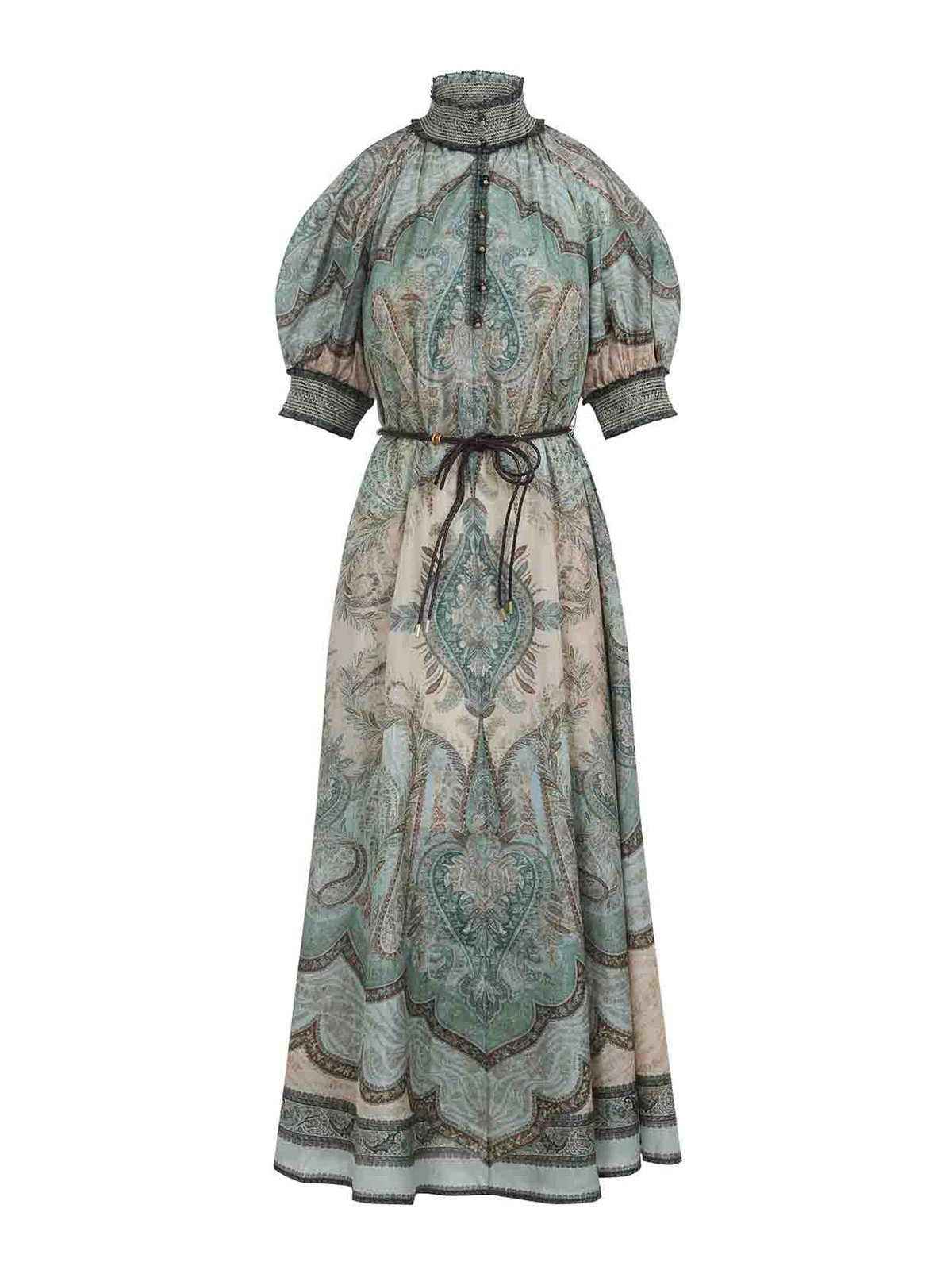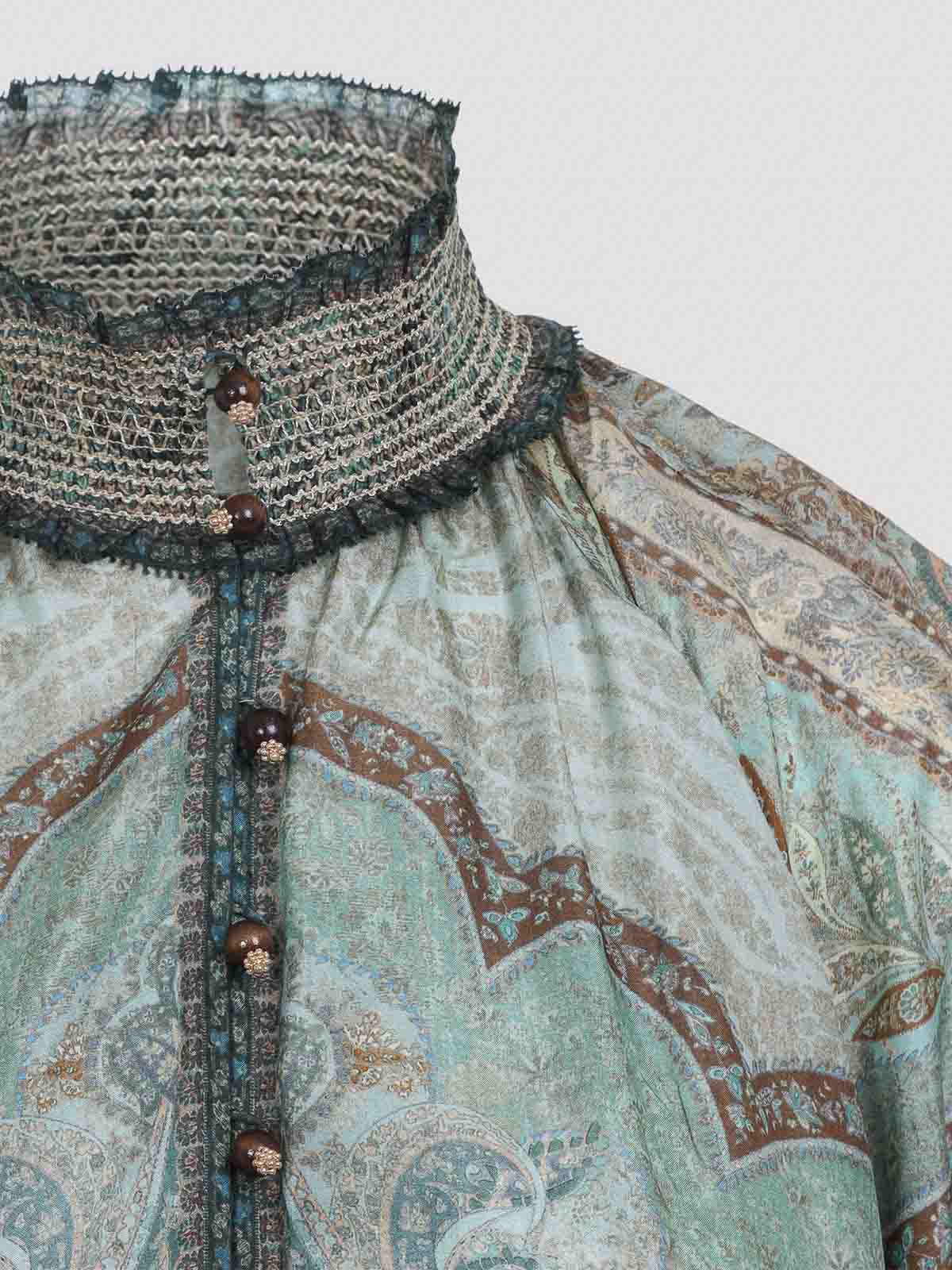 Vestito fluttuante in seta multicolore verde acqua con arazzo Zimmermann. Vestito in pura seta. colletto in piedi, chiusura frontale con semibottoni, cintura marrone regolabile, maniche corte a sbuffo con bordi elasticizzati, gonna lunga svasata, fondo dritto. disegno floreale blu, beige e marrone su tutta la superficie.