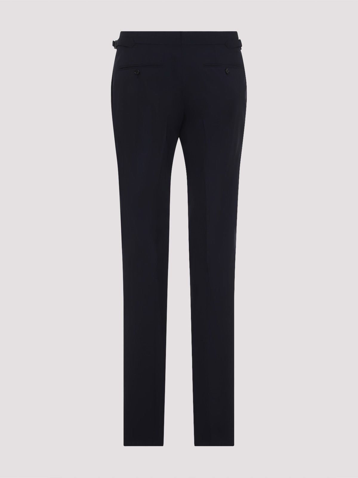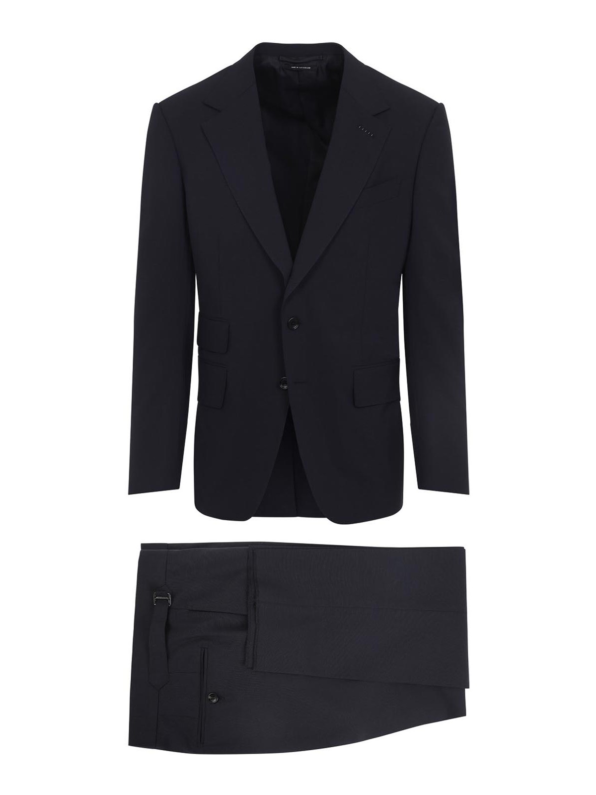 Vestito in lana blu Tom Ford. realizzata in lana blu, giacca monopetto, revers a specchio, spalle rinforzate, chiusura con bottoni, tasca a filetto sul petto, tre tasche sul davanti, maniche lunghe con bottoni ai polsi, spacco centrale dietro. pantaloni tono su tono, con linguette scorrevoli ai lati, tasche alla francese, chiusura frontale nascosta, tasche a filetto posteriori, gamba dritta, orlo non rifinito pronto per la confezione.