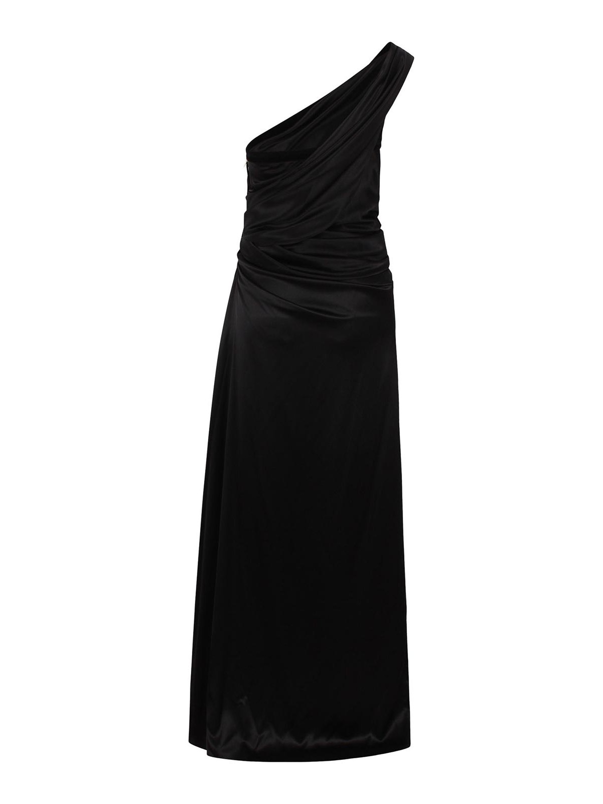 Vestito lungo drappeggiato asimmetrico in satin di nina ricci, silhouette femminile ed elegante, perfetto per le tue serate speciali. monospalla, fasciato in vita, spacco laterale, design drappeggiato, orlo asimmetrico, chiusura con zip laterale.