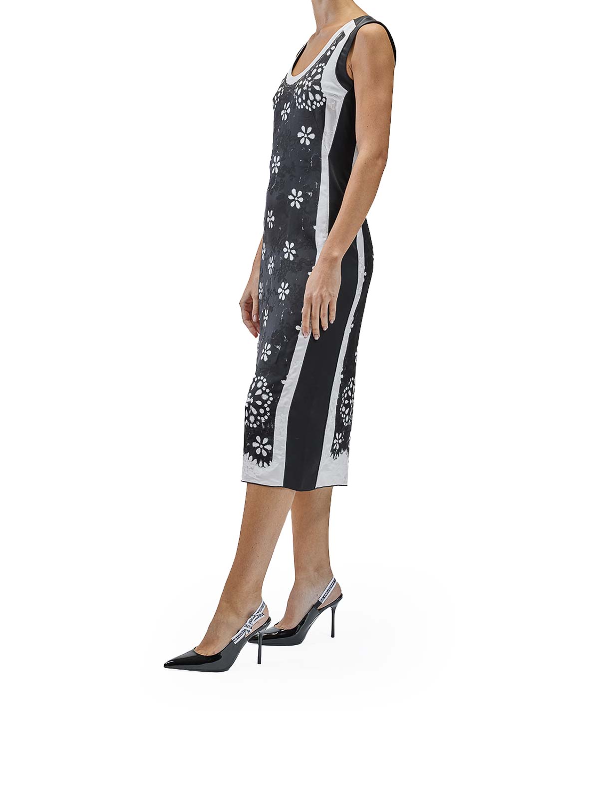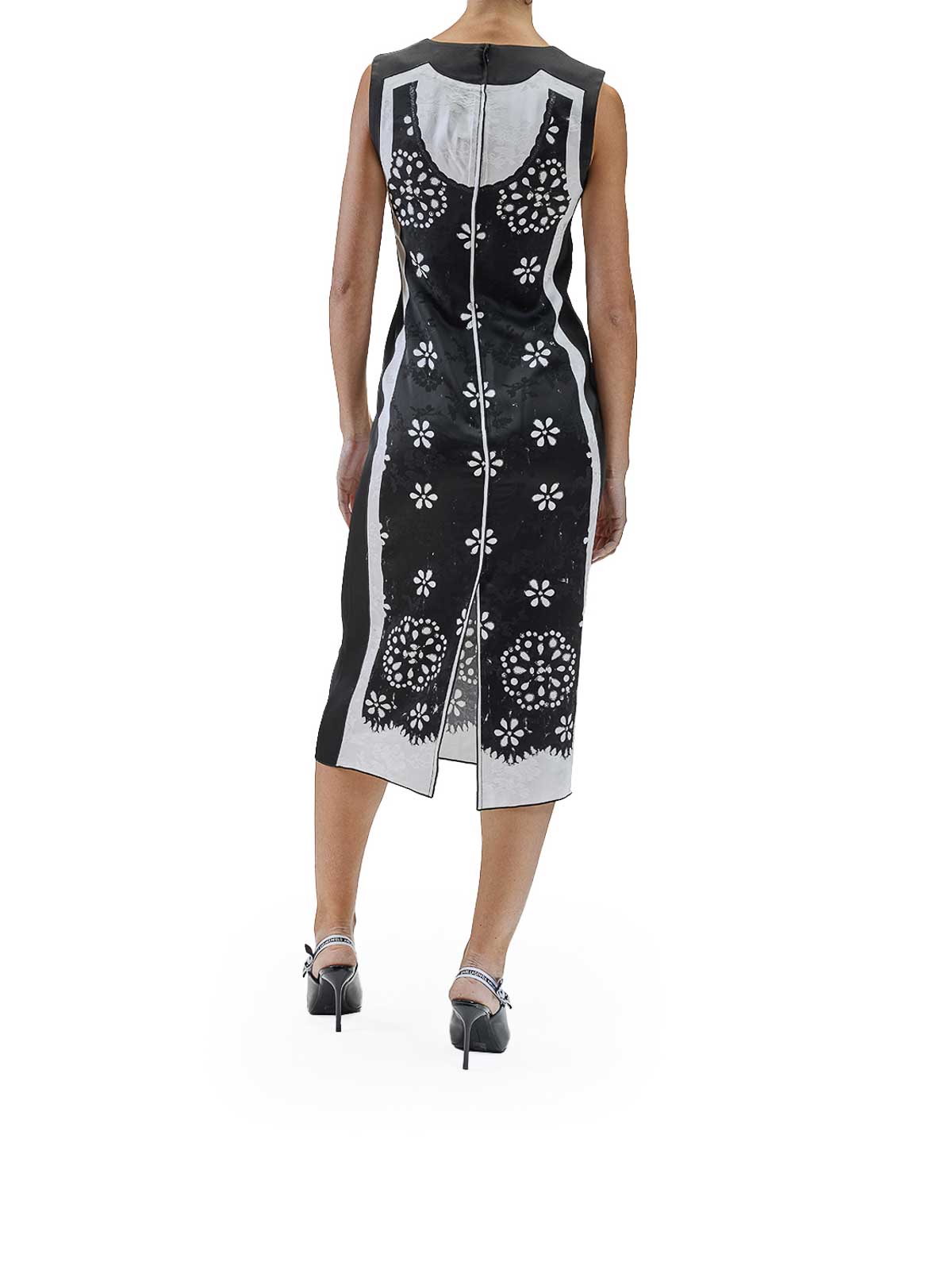 trompe l'oeil eyelet dress in nero/bianco. abito sottoveste di marc jacobs con stampa trompe l'oeil, testurizzata con elementi in rilievo e inserti in crepe. dotato, di chiusura con zip e spacco sul retro. smanicato, girocollo, stampa trompe l'oeil, dettagli testurizzati, chiusura con zip sul retro, spacco centrale sul retro.