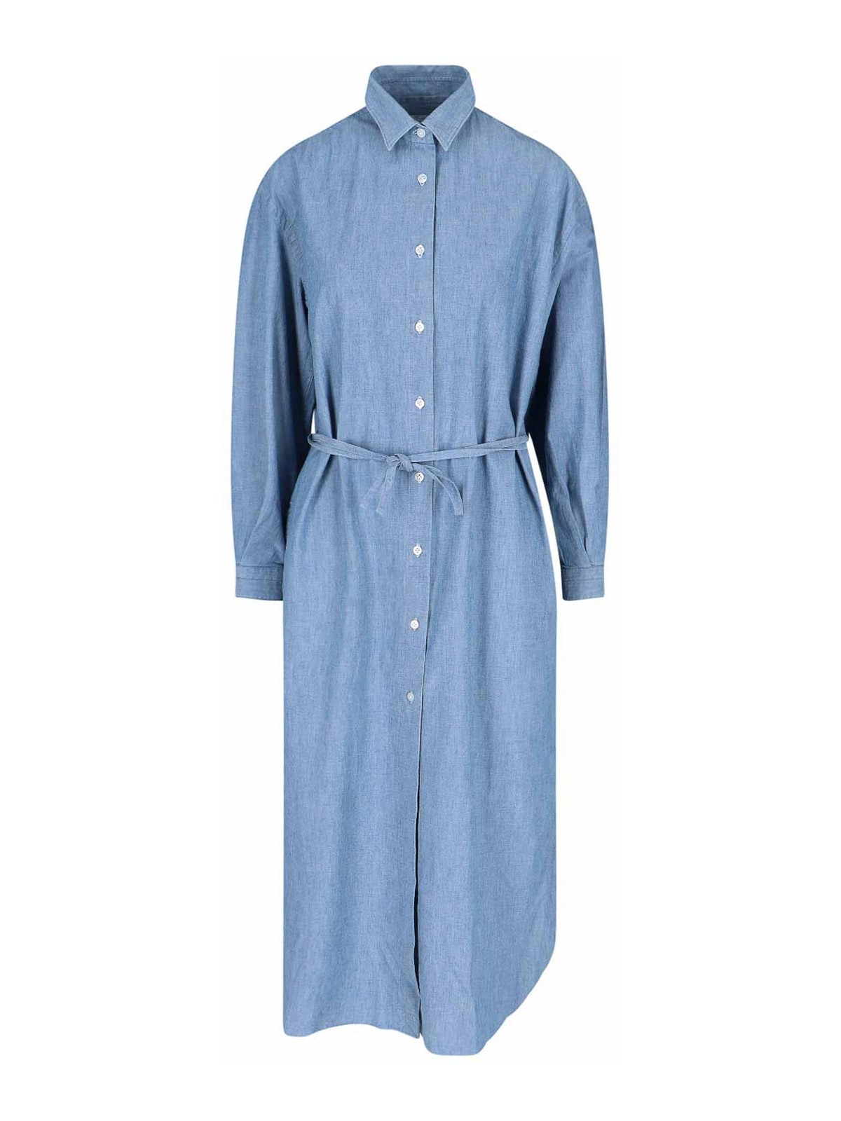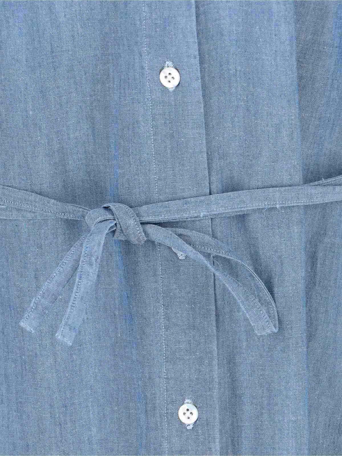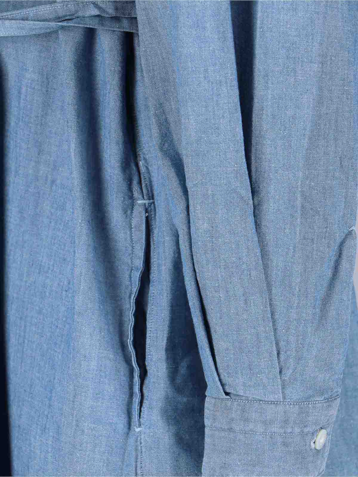 Vestito maxi chemisier finamore 1925, in cotone azzurro, colletto classico, chiusura bottoni, cintura regolabile in vita, due tasche laterali, spacchi laterali, gonna drappeggiata, bottoni polsini, orlo dritto.