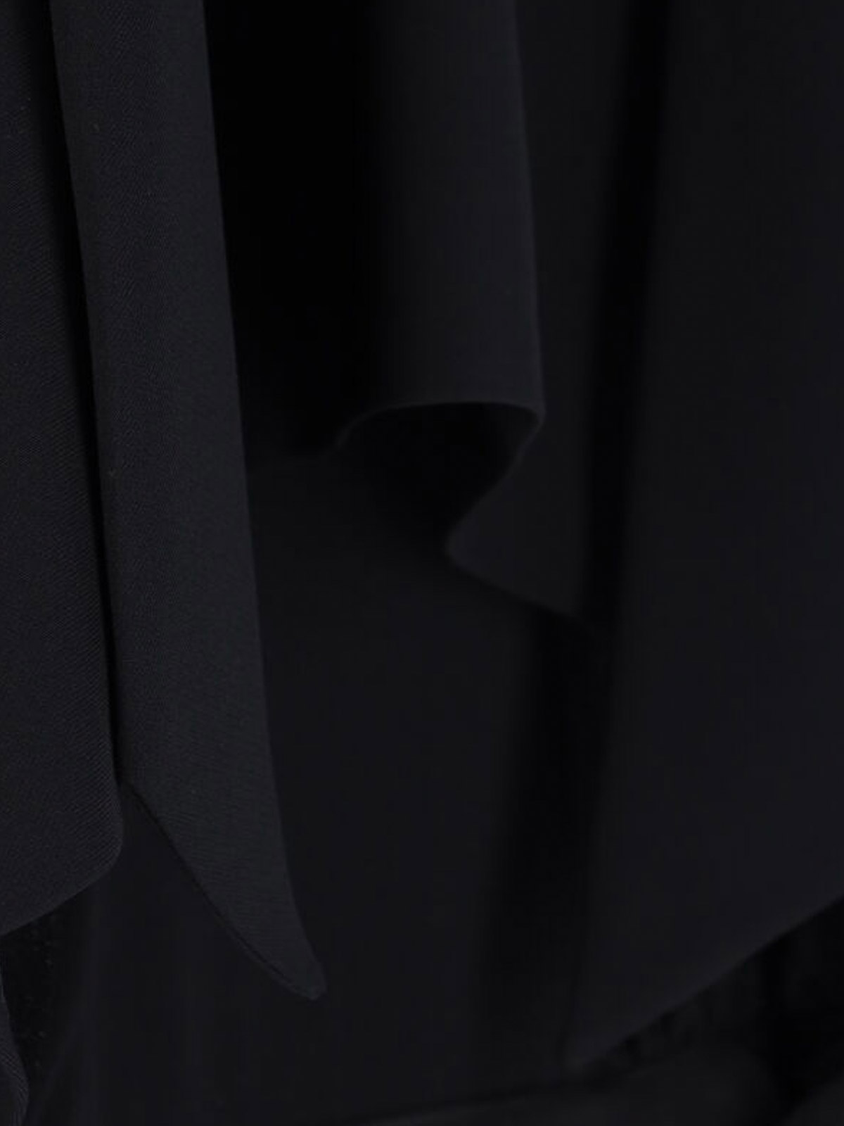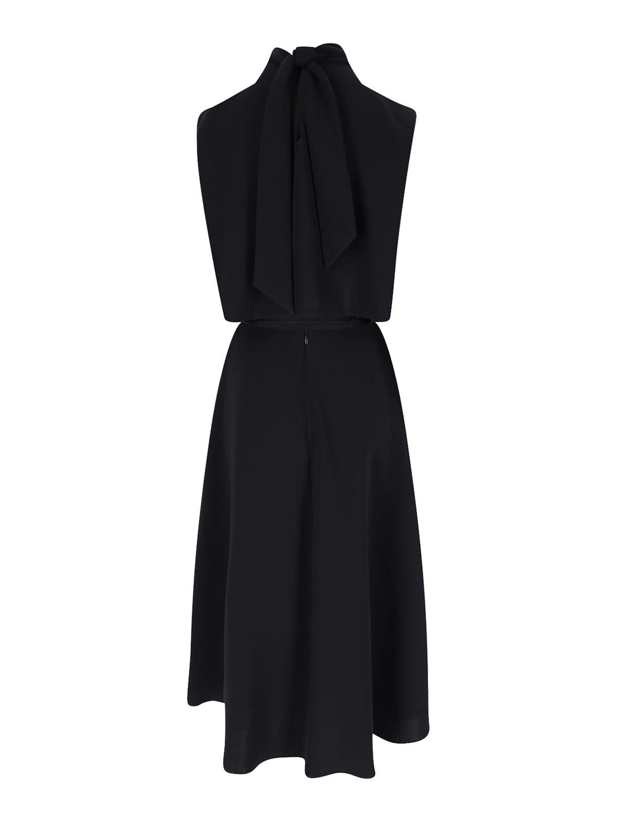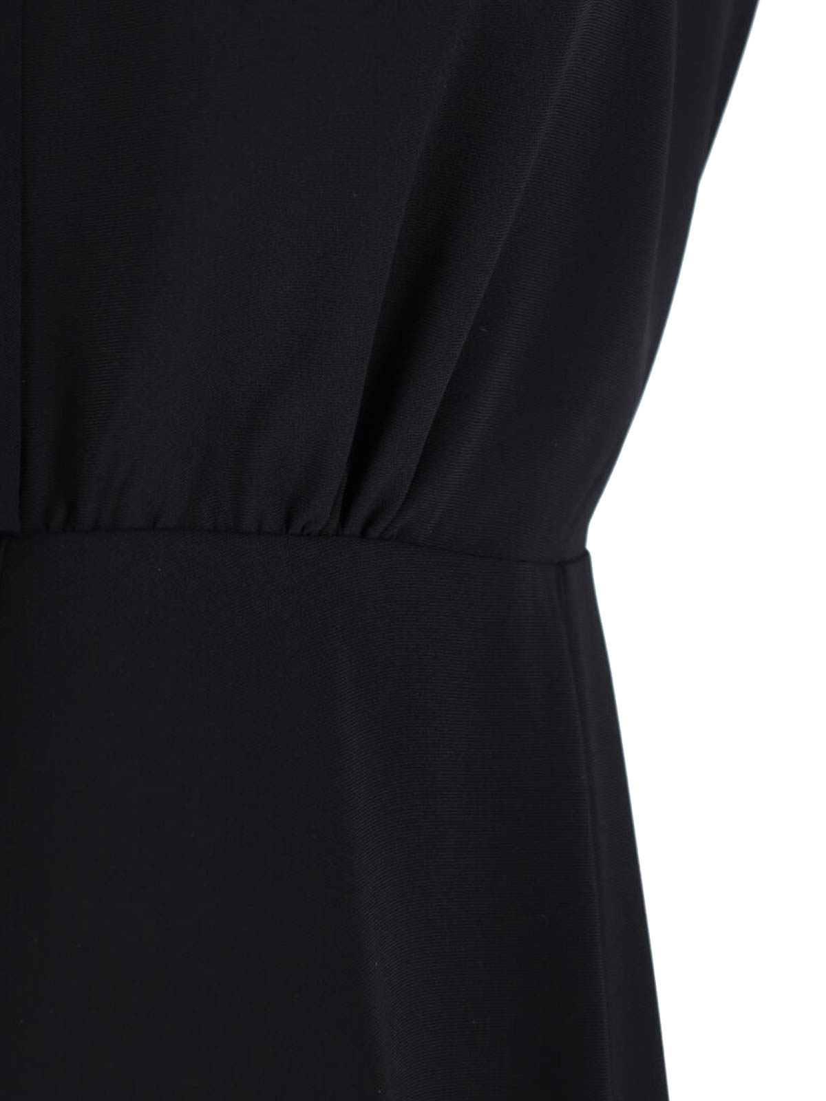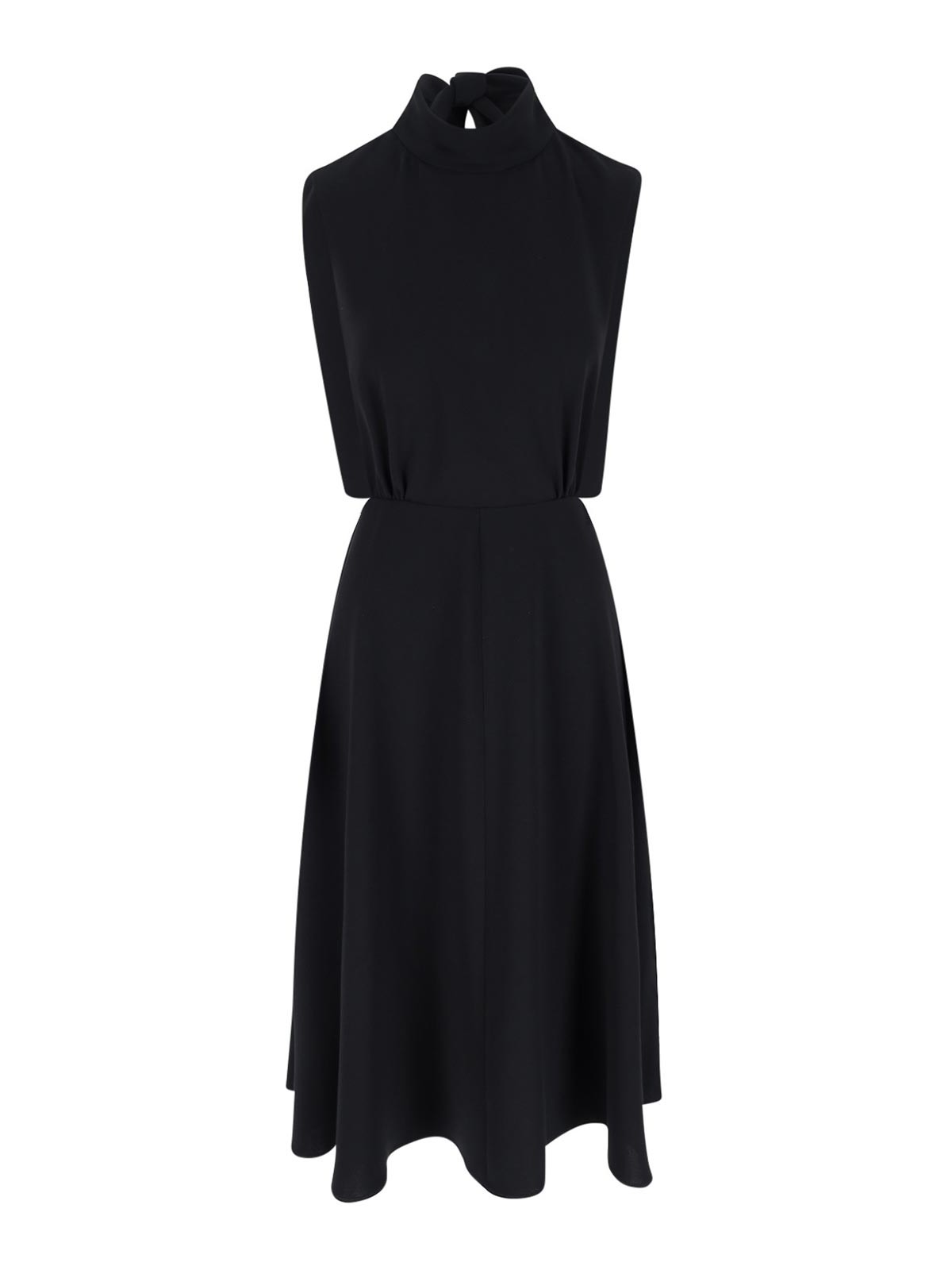 Vestito midi aspesi in tessuto nero, collo alto, chiusura zip retro, dettaglio fiocco retro, orlo dritto.