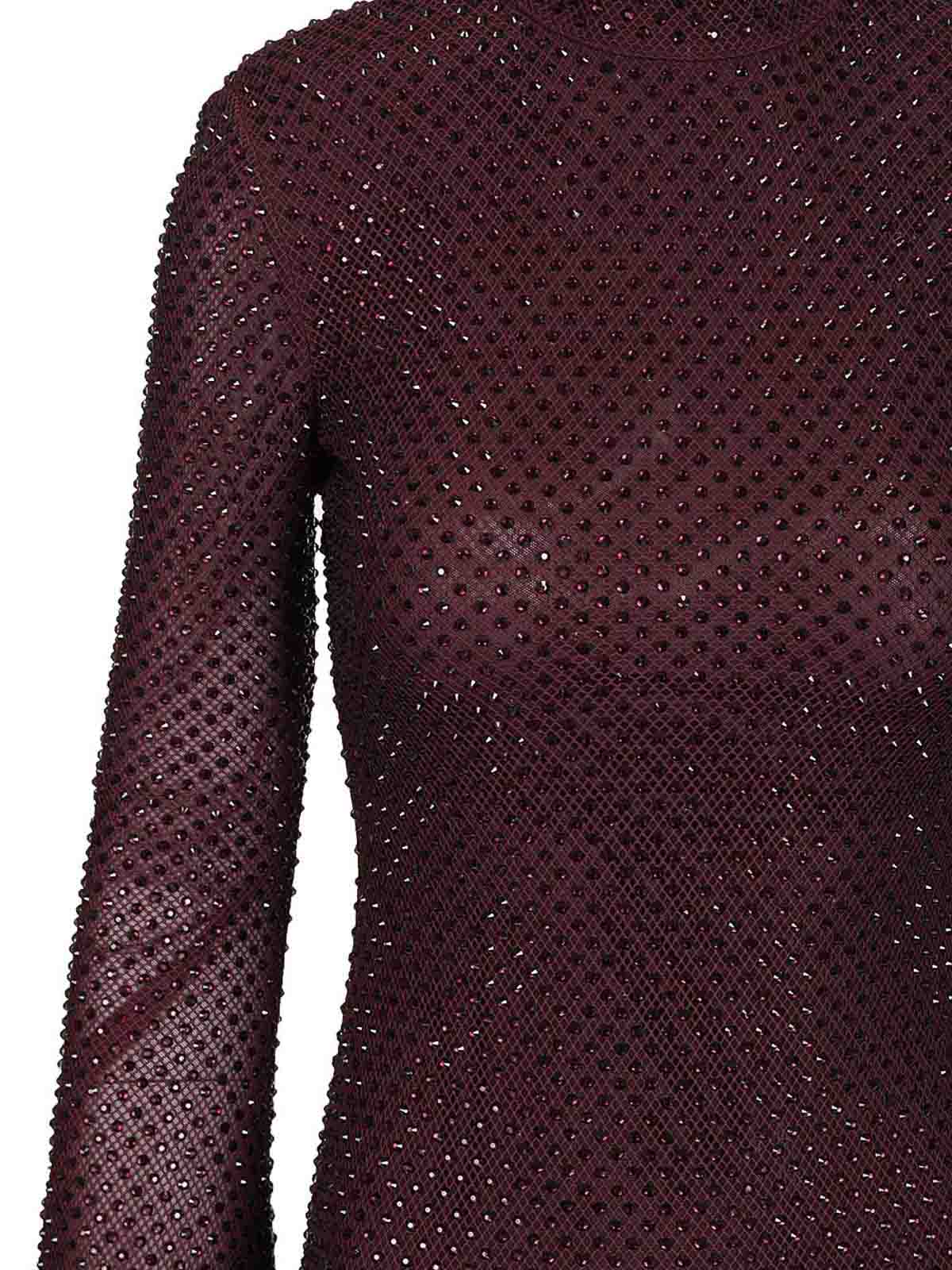 Vestito midi autoritratto in rete con strass con finitura lucida, lunghezza midi, fondo svasato, scollo alto, tessuto elasticizzato, fodera in rete e chiusura con zip sul retro.