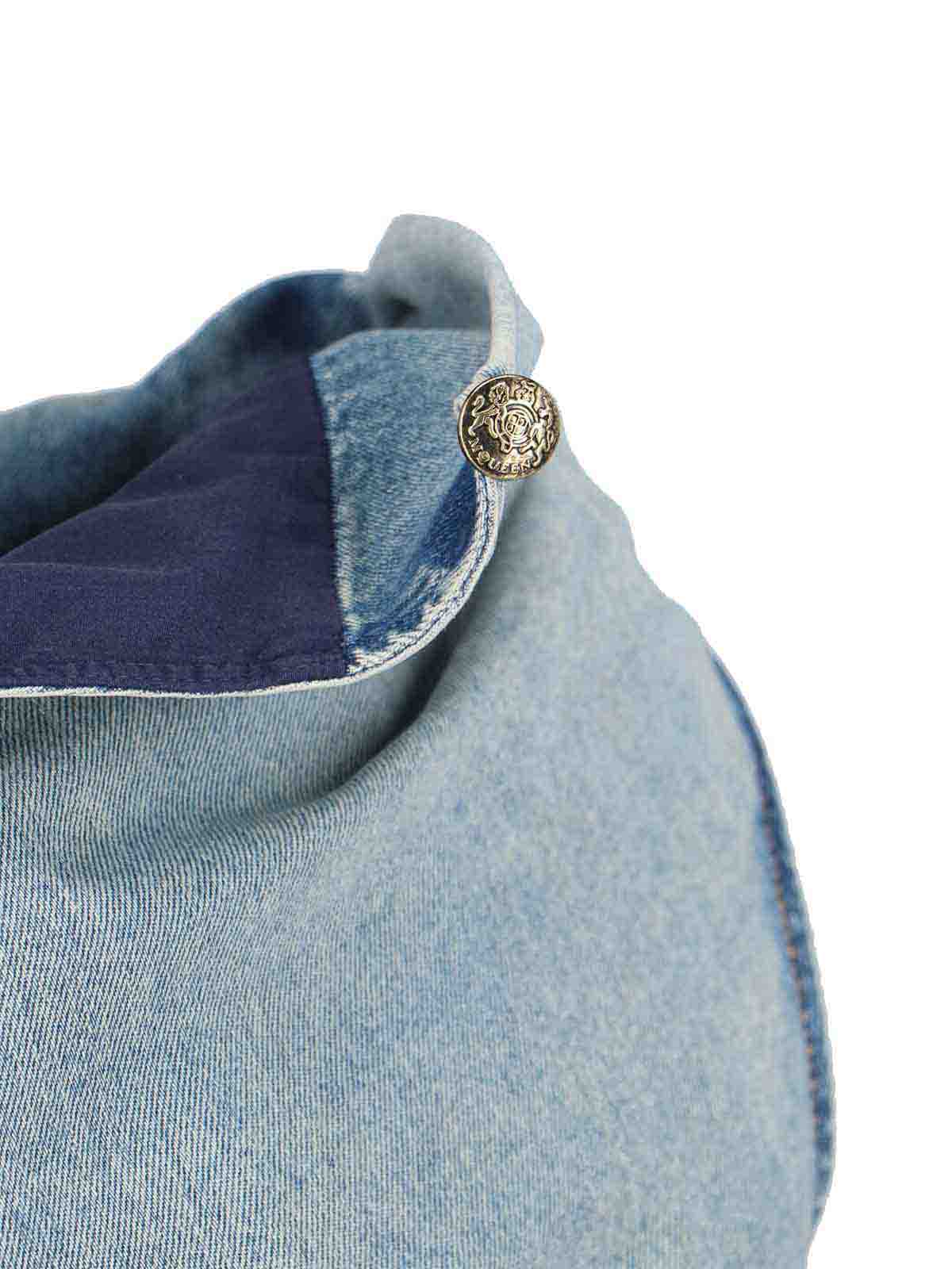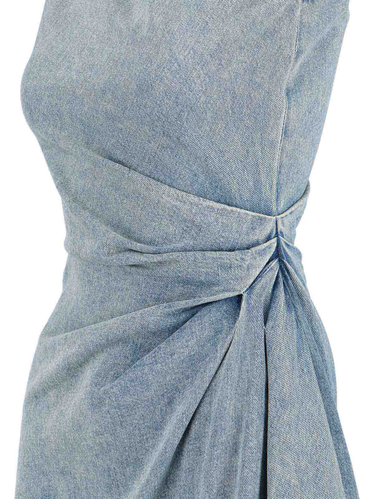Vestito mini alexander mcqueen in denim di cotone azzurro, senza maniche, chiusura zip laterale, arricciato fronte, dettaglio bottone logo impresso in metallo dorato, orlo asimmetrico.
