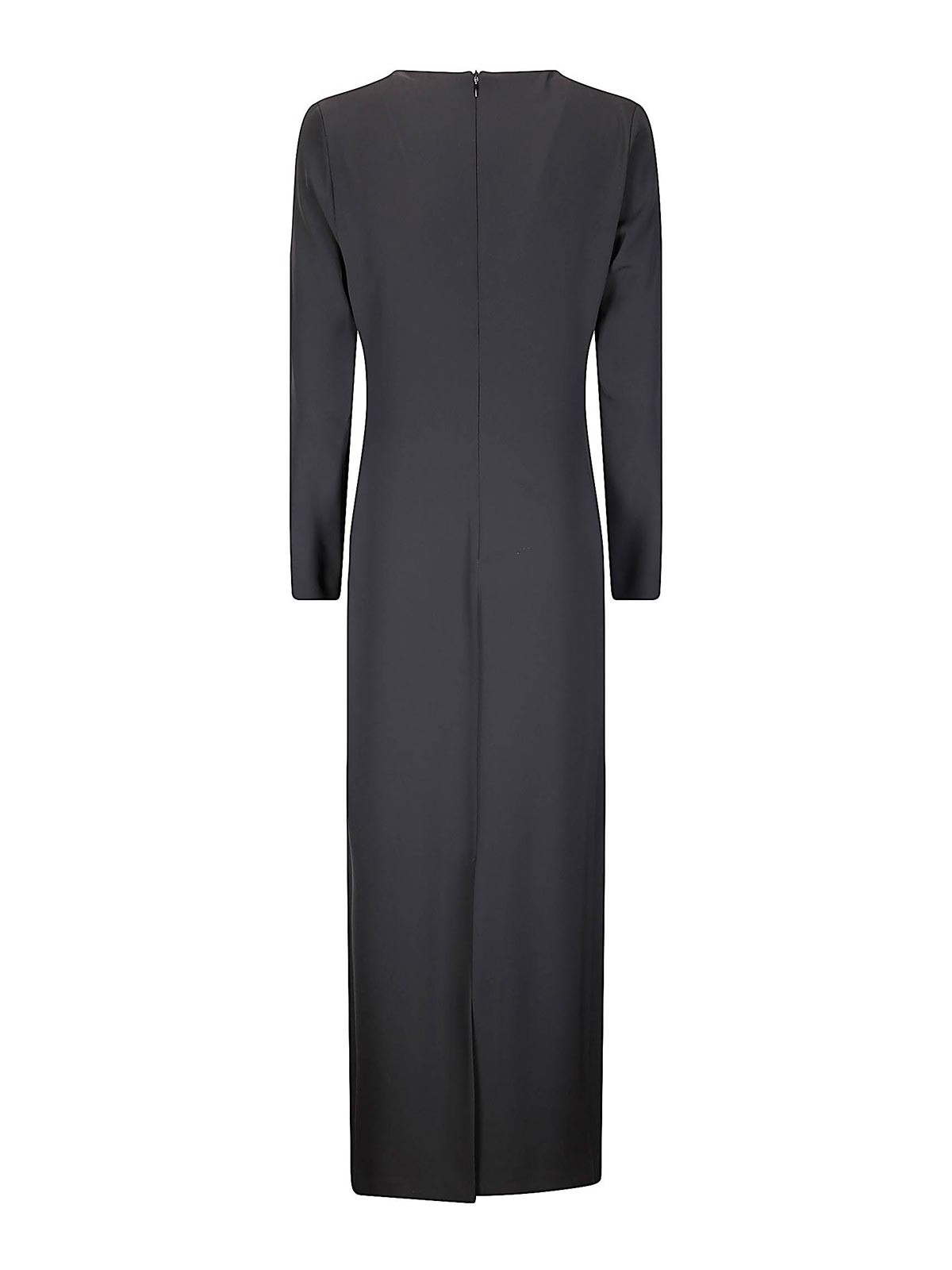 Vestito nero lungo lineare con scollo a v, spacco posteriore, chiusura con zip nera posteriore.