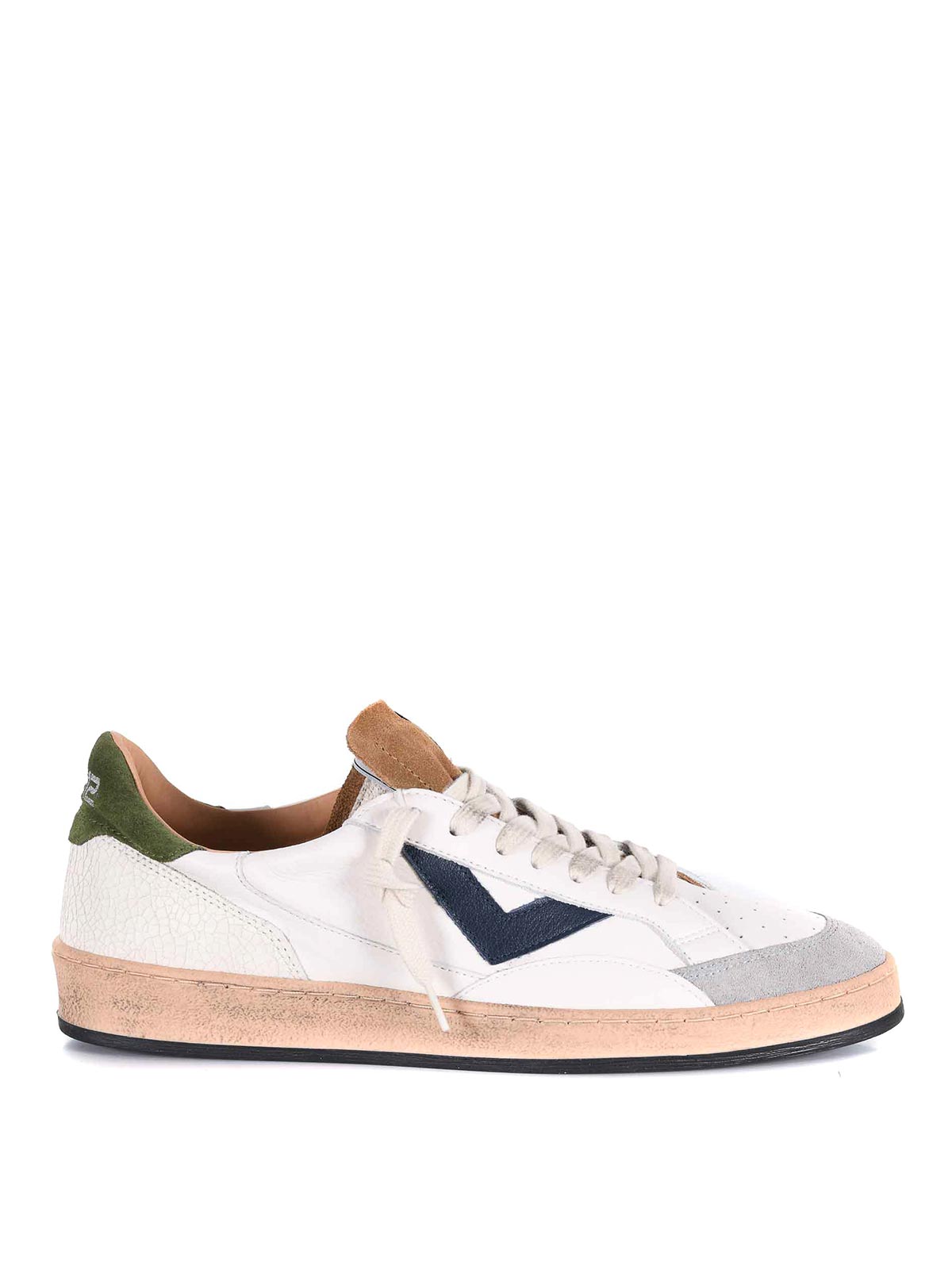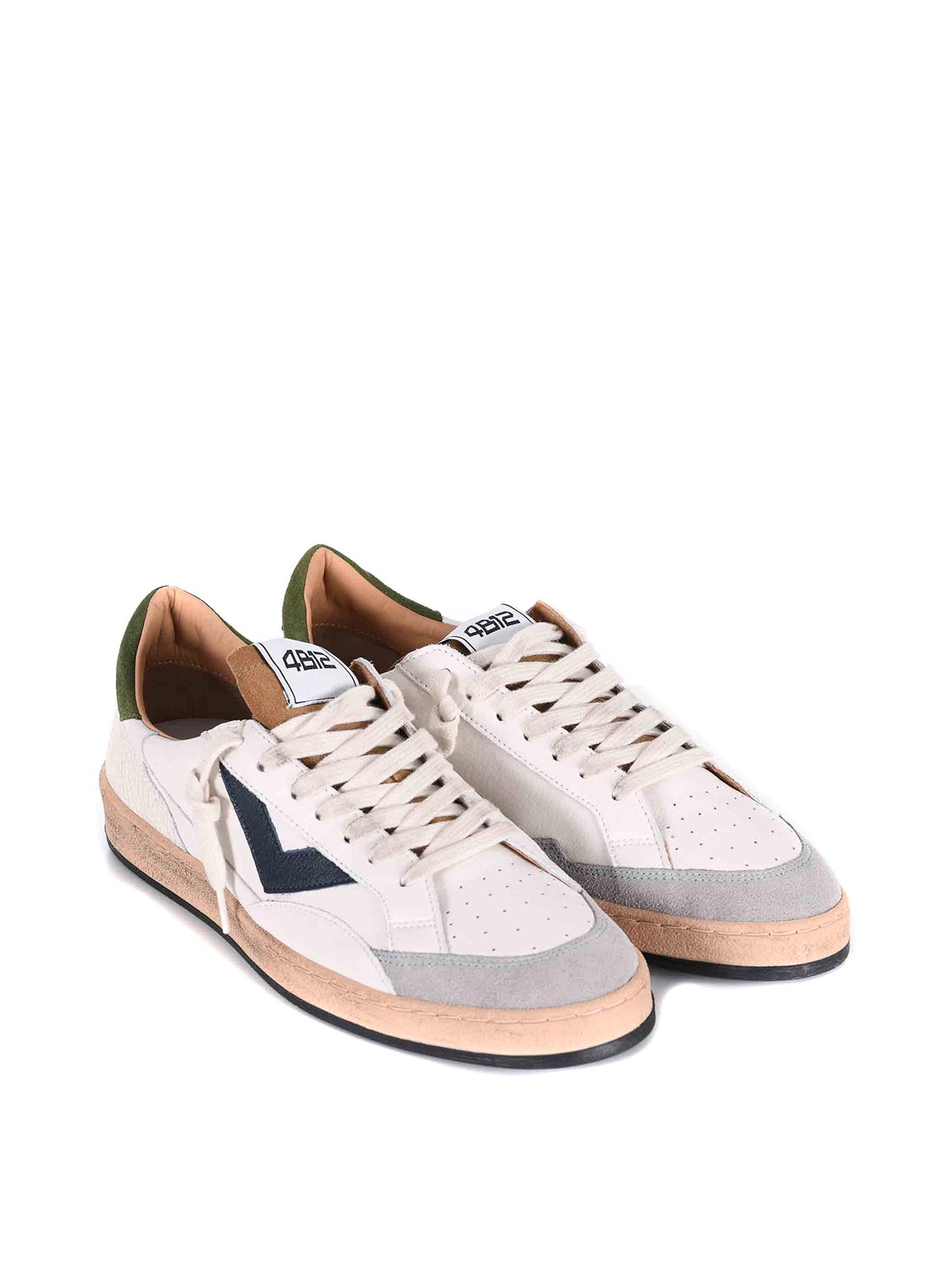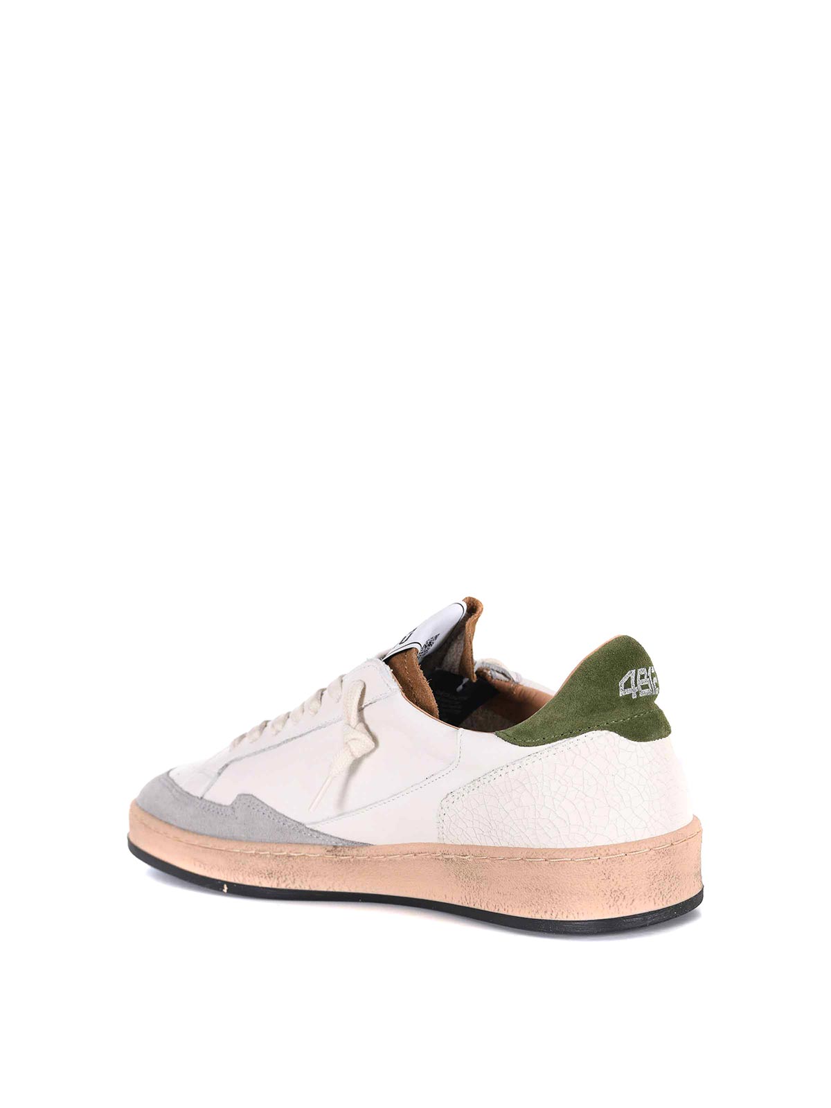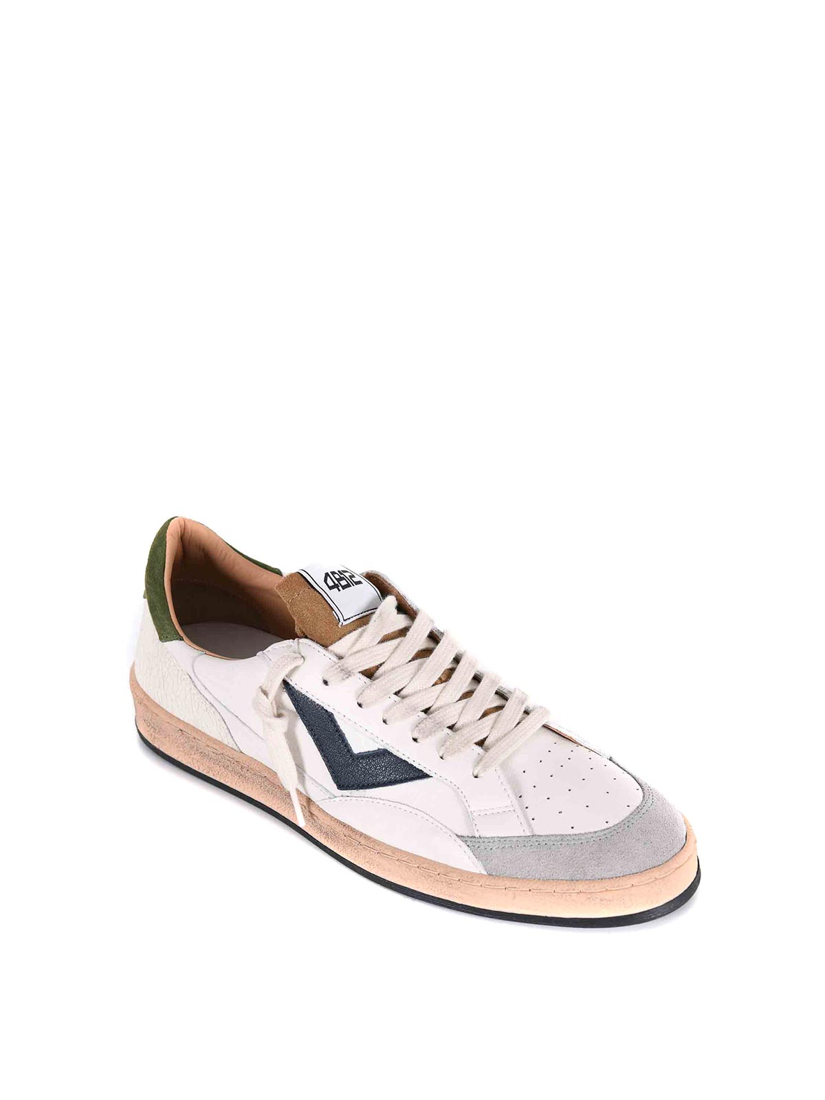 ホワイトレザーとグレースエードの4B12スニーカー。コントラストの効いたインサート。意図的に染色された部分にはヴィンテージ効果。意図的に染色されたレース。背面にグリーンスエードインサート。ステイン部分のあるユーズドエフェクトラバーソール。写真のサイズ:42 100% レザー