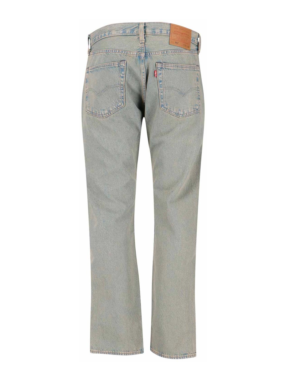 Levi's Strauss 501ジーンズ、ライトブルーデニム、ウォーンウォッシュ、ミディアムウエスト、ベルトループ、ボタンクロージャー、5ポケットデザイン、背面ロゴパッチ、背面に赤いロゴラベル、ストレートレッグ。