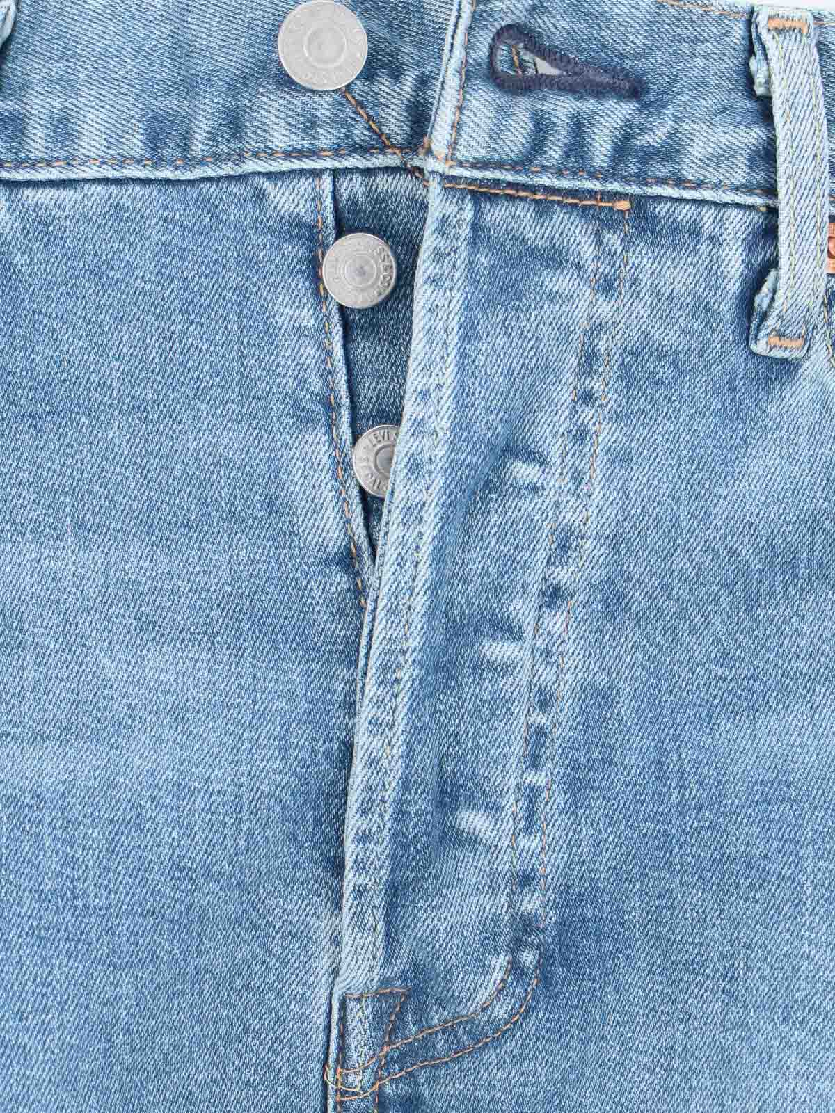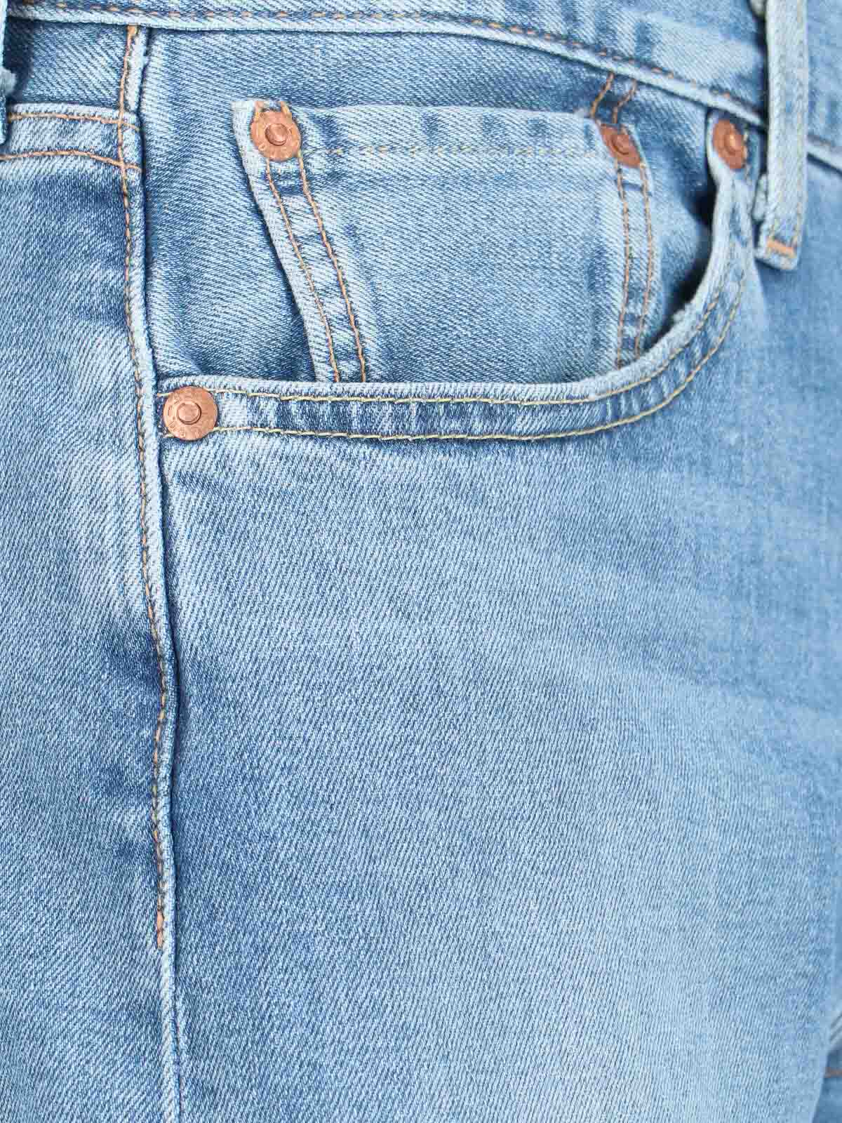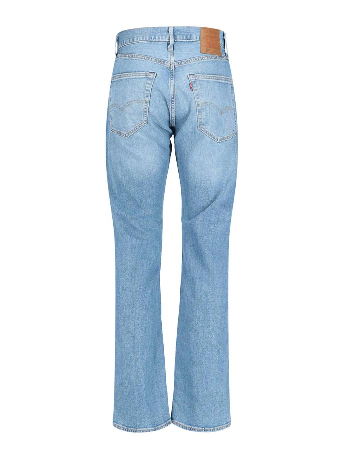 リーバイスストラウス501ジーンズ、ブルーデニム、ドレープデザイン、ミディアムウエスト、ベルトループ、ボタンクロージャー、ファイブポケットデザイン、背面に茶色のロゴパッチ、背面に赤いロゴラベル、ストレートレッグ。