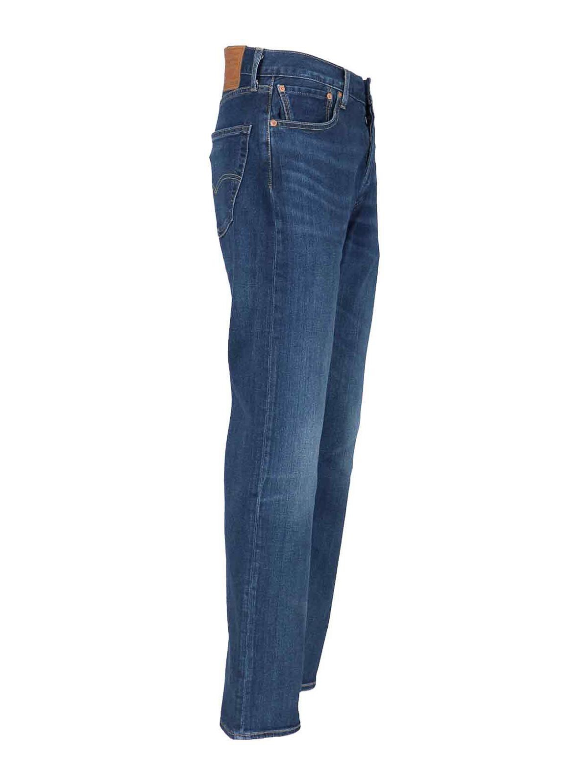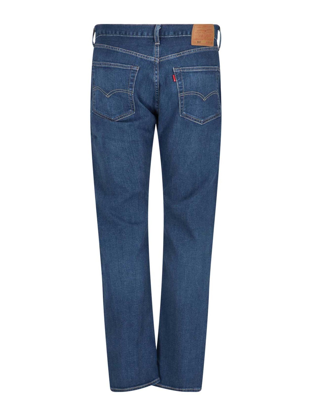 リーバイスストラウス501ジーンズ、ブルーデニム、ドレープデザイン、ミディアムウエスト、ベルトループ、ボタンクロージャー、ファイブポケットデザイン、背面に茶色のロゴパッチ、背面に赤いロゴラベル、ストレートレッグ。