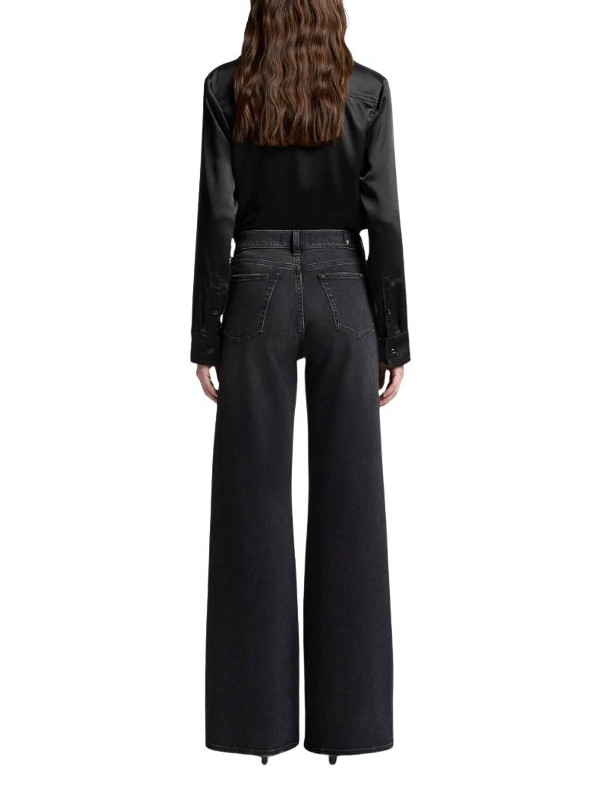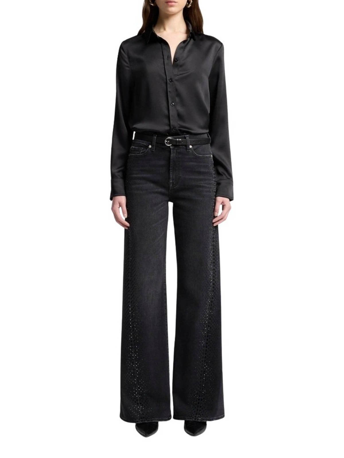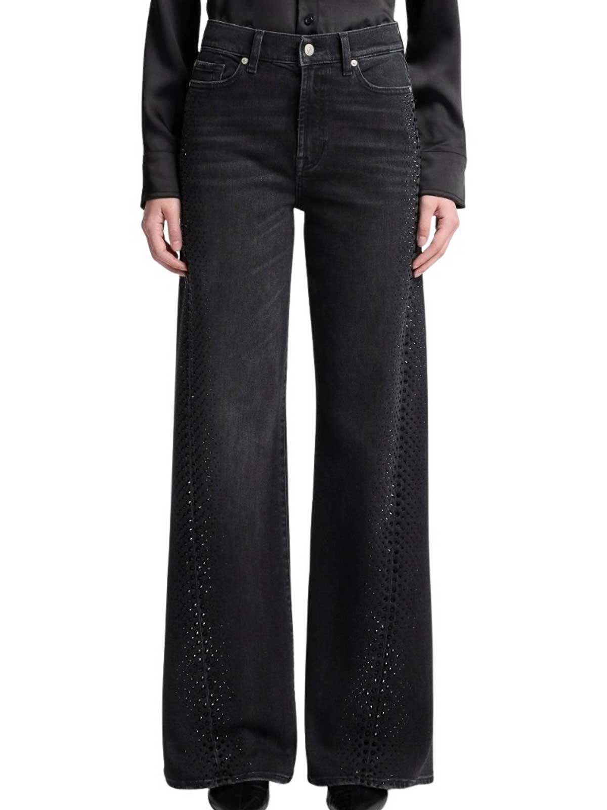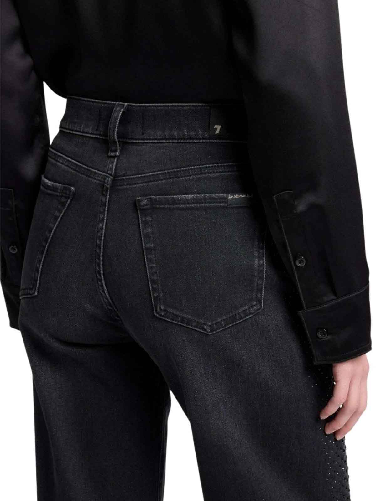 7 for all mankind デニム:ハイウエストで体型を引き立てるスタイル。幅広でゆったりとした脚と、ツイストした縫い目でさわやかな雰囲気を醸し出しています。贅沢で着心地の良いこの中厚デニムは、心地よい柔らかさと適度な伸縮性を備えています。ブラックウォッシュ、ツイストシーム、サイドシームにクリスタルの装飾、ジッパーとボタン留め、すっきりとしたバックポケット、スタッズ付きのツイストシーム。