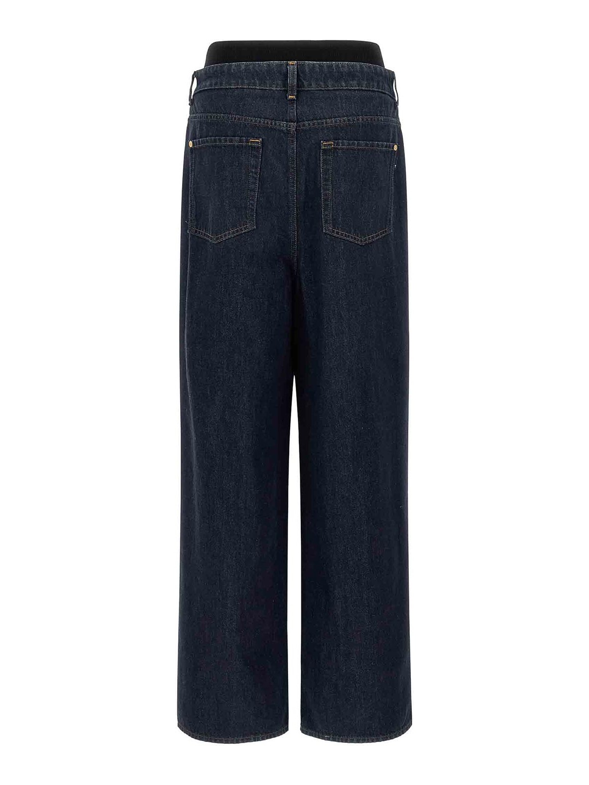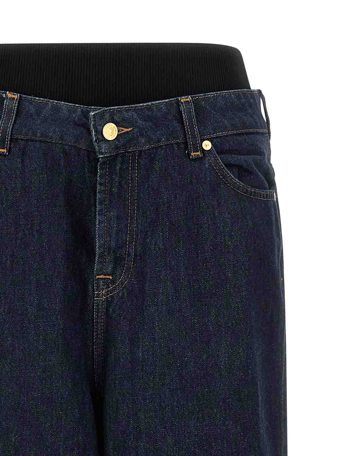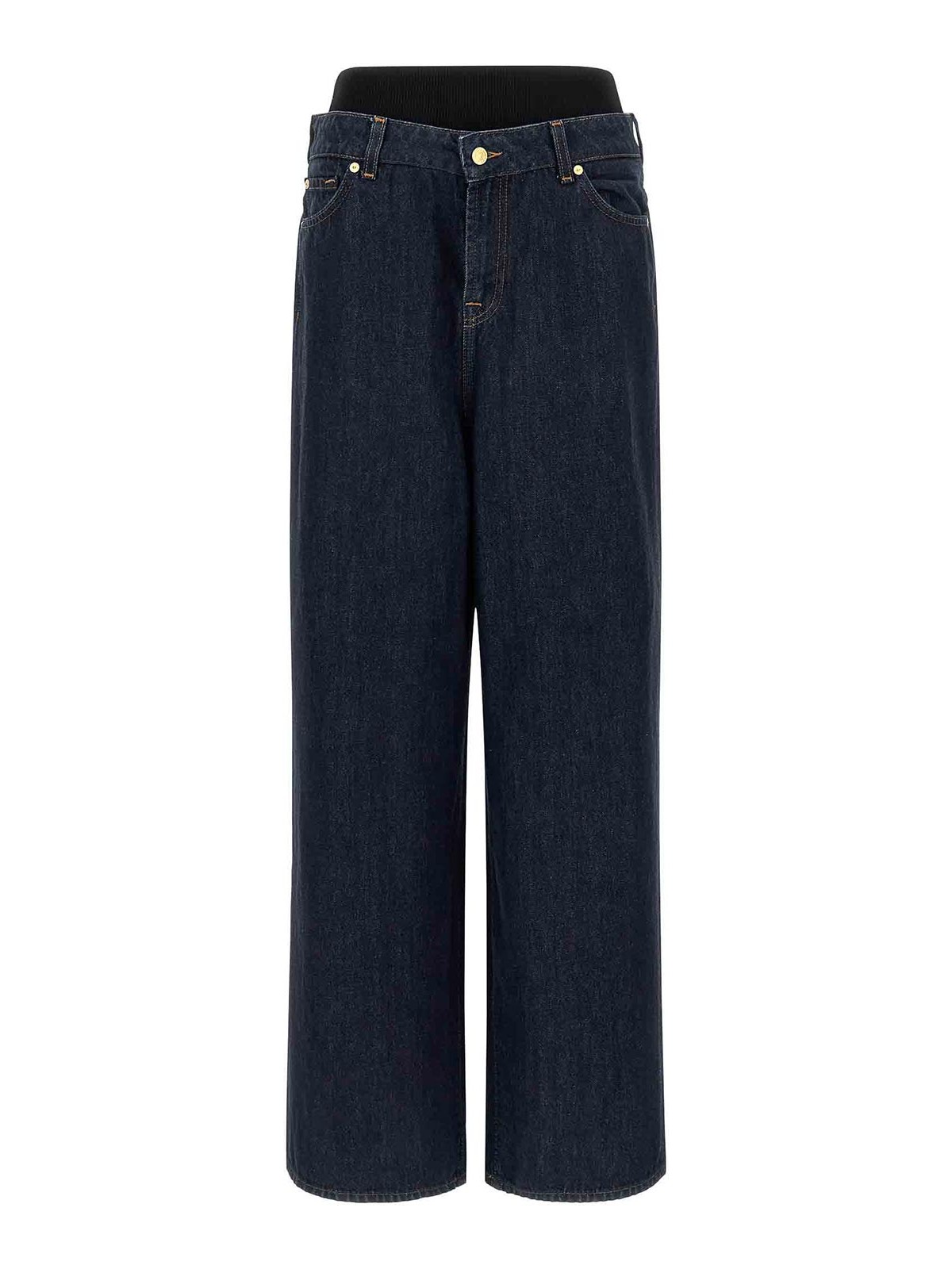 コントラストステッチのバンド付きスラウチーワイドコットンデニムジーンズ、リブ編みのストレッチ生地のウエストインサート、ロークロッチ、ジッパーとフロントボタンクロージャー、ワイドレッグ、5つのポケット。