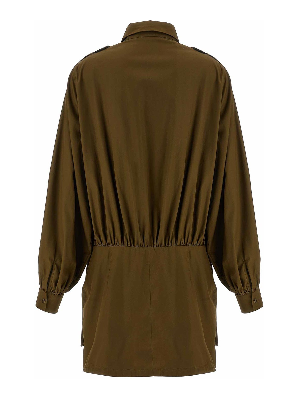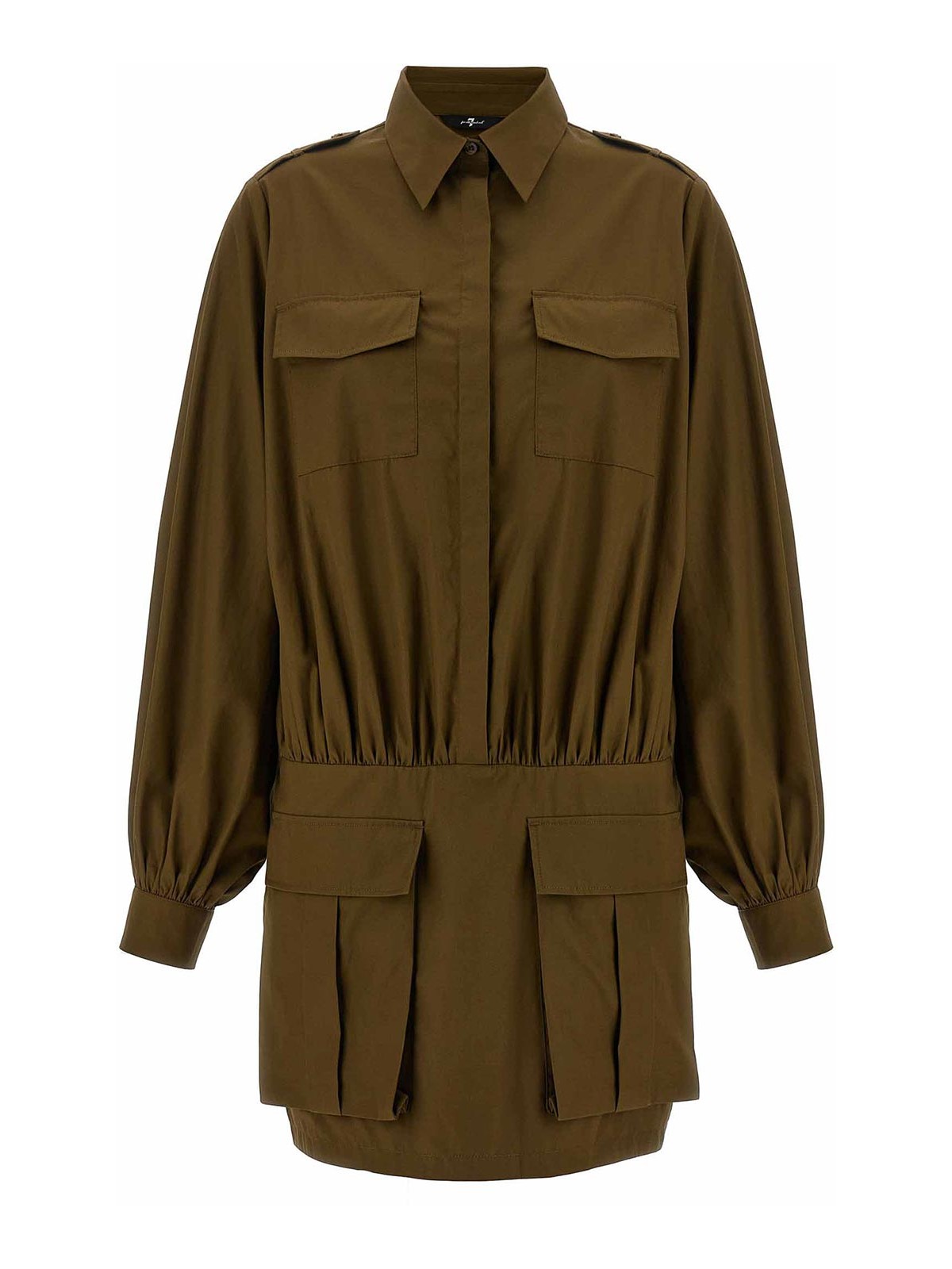 シャツの襟が付いたコットンポプリンのミニ「ユーティリティ」ドレス、隠しボタン付きのフロントクロージャー、フロントパッチポケット、隠しサイドジッパー付きスカート、袖口とボタン付きのロングスリーブ。