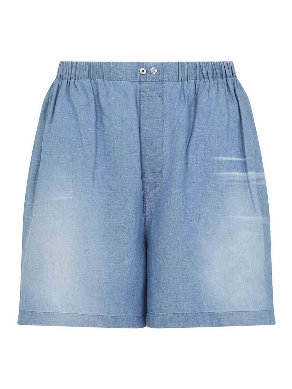Acne Studiosのミッドブルーコットンショーツ。コットンとリネンの混紡素材を使用。伸縮性のあるウエストバンド、フロントボタン付きディテール、サイドポケット、ストレートヘム。オーバーウォッシュデザイン、バックにレタリングロゴ。