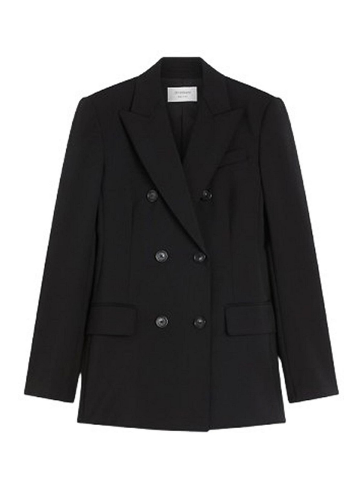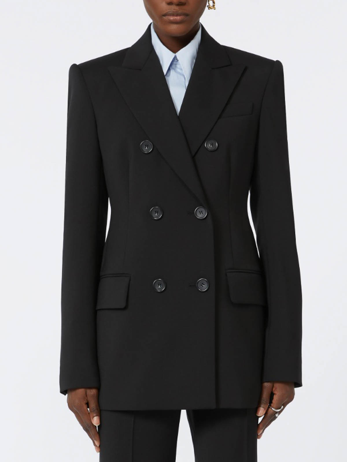 ピュアナチュラルストレッチウール製テーラードブレザー。内側に裏地付き。カラー:ブラックスリムフィットのピークラペルダブルブレストクロージャー、ボタンが露出しているサイドフラップポケット