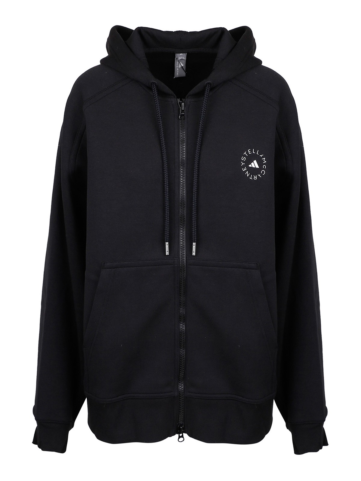 アディダスバイステラマッカートニージップアップフード付きスウェットシャツ、胸と背中下部にロゴプリント。