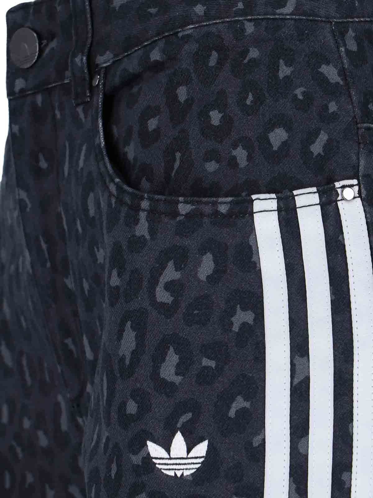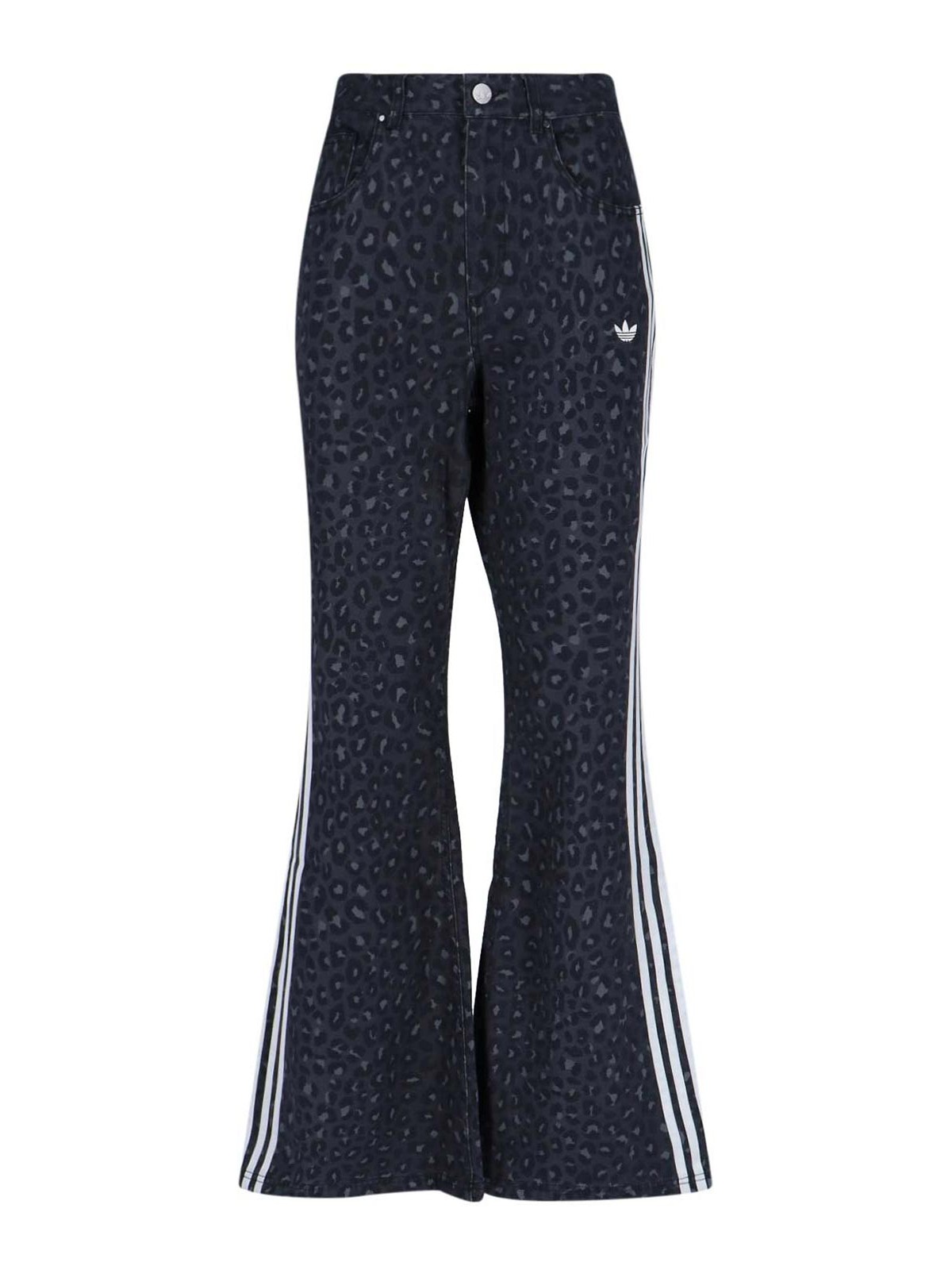ジーンズブーツカットのアディダスロゴ入りブラックデニムプリントモチーフ。ハイウエストのヒョウ柄のパッサー付き。ベルトとファスナー付き。ポケット5つ。横にロゴが入ったアイコニックなバンド。三つ葉のサイドパッチ。バックボーンロゴ。ワイドレッグ。