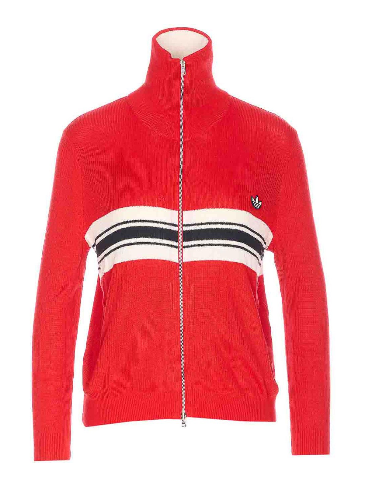 アディダスオリジナルズバイウェールズボナーレッドジップスウェットシャツ、ハイネック、ロングスリーブ、前面にパッチロゴ、横にジッパーポケット