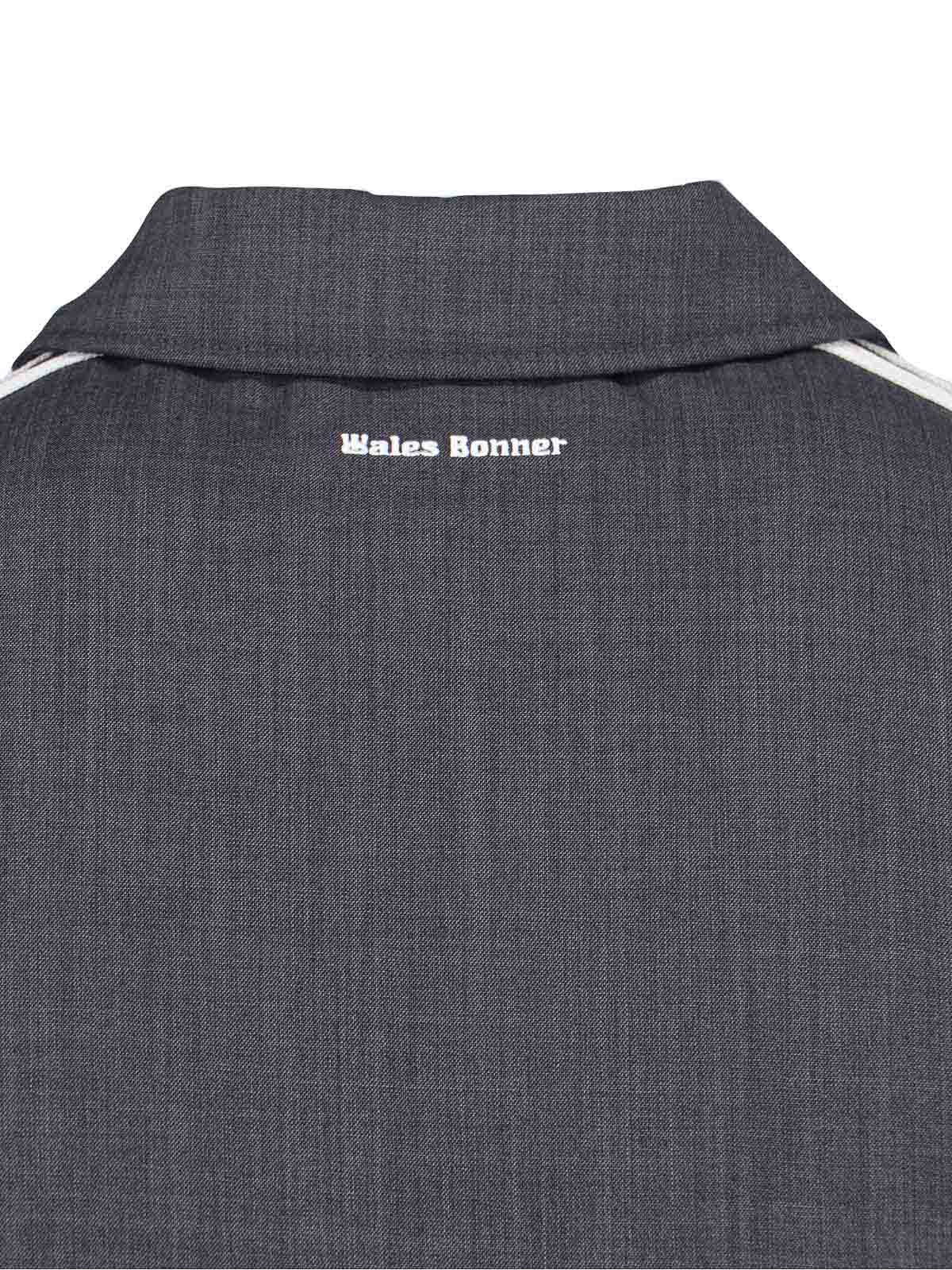 アディダス×ウェールボナーウール混紡ジャケット、グレー、クラシックカラー、前面にファスナーとボタン留め、前面にコントラストカラーの三つ葉ロゴ刺繍、アイコニックなサイドバンド、ストレートヘム。