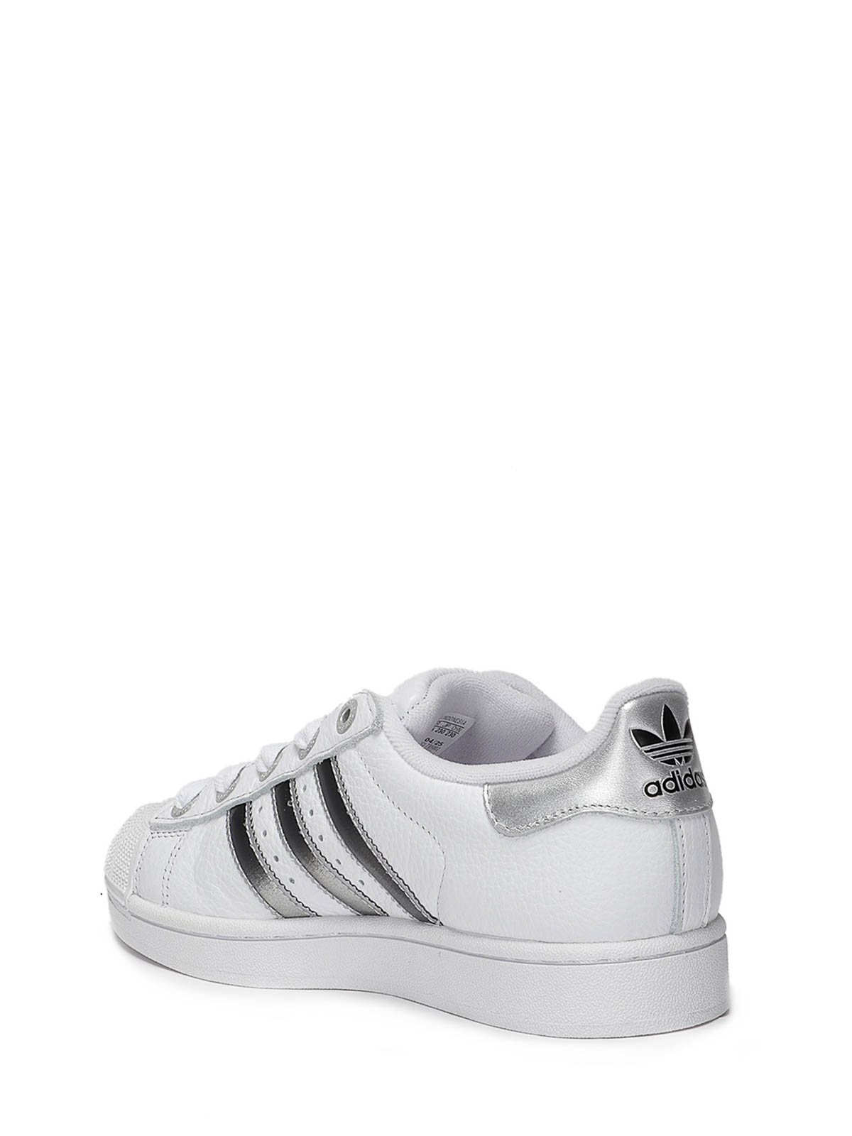 コントラストの効いたシルバーのストライプ、太くて平らなレース、スチールアイレット、ブラックロゴのシルバーヒールをあしらったホワイトレザースニーカー。