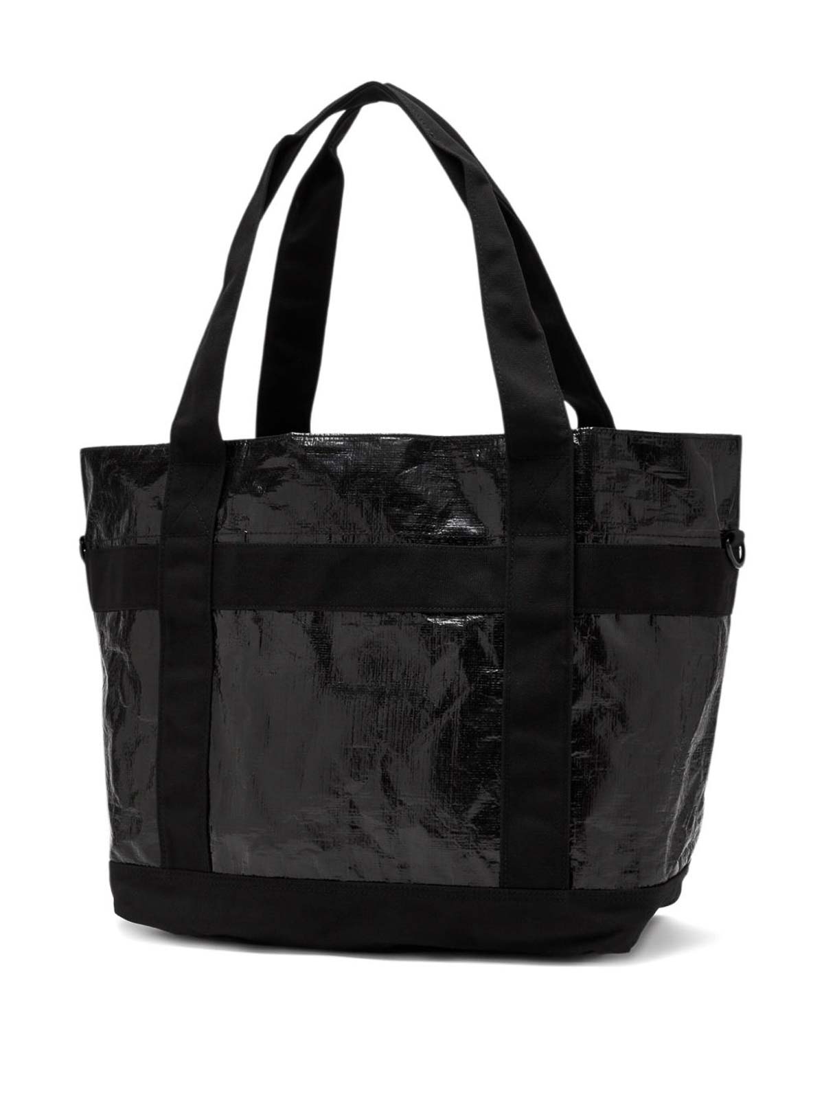 ブラックトップハンドルショルダーストラップパネルデザイン内側にファスナー付きポケットフロントロゴパッチ