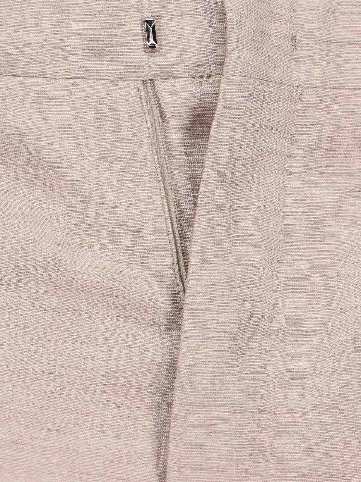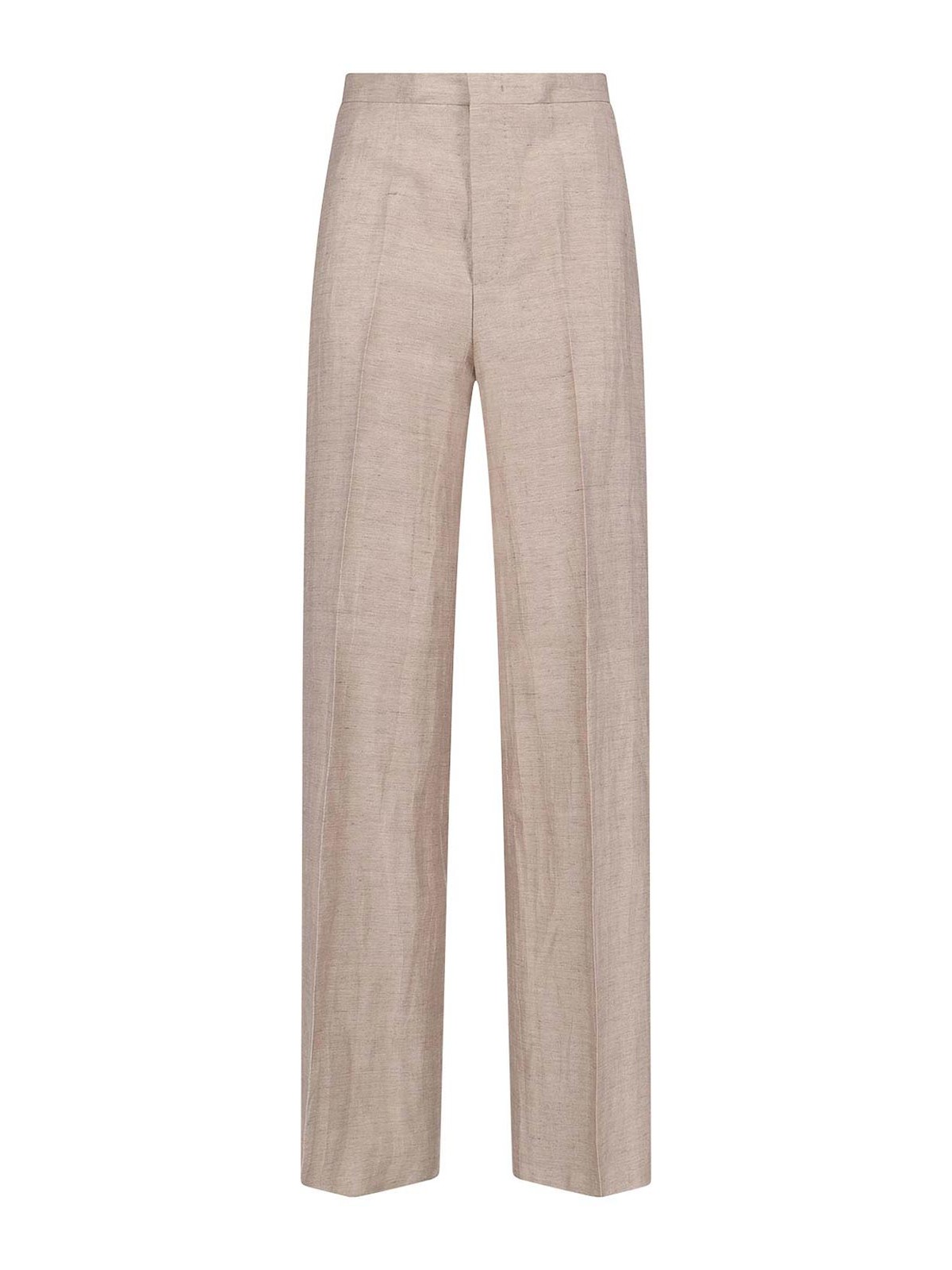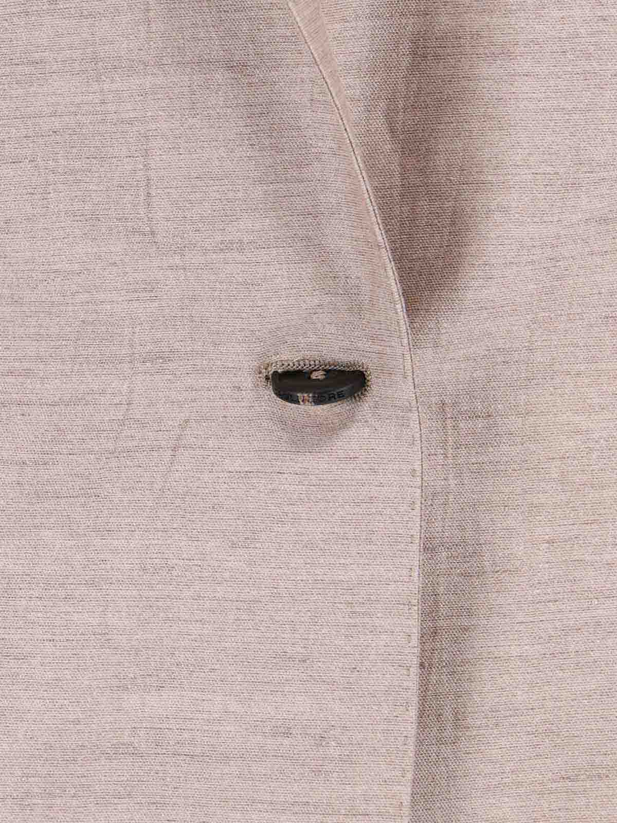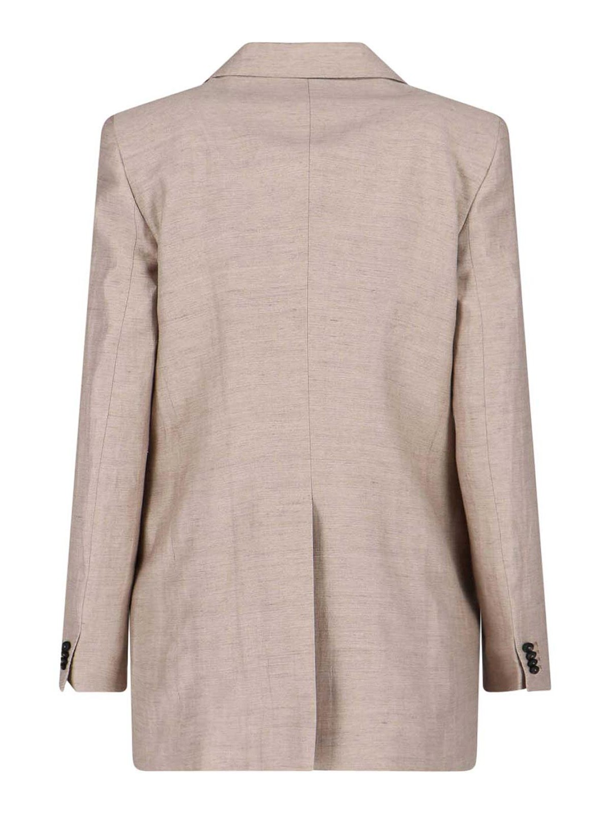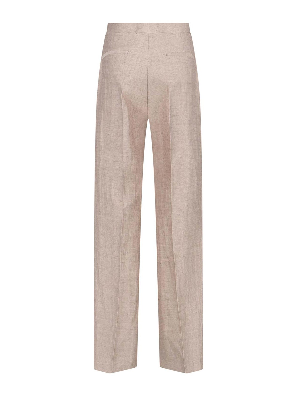Adrianne Tagliatoreのシングルブレストスーツ。ベージュのリネンとコットンの混紡素材を使用した、Vネック、クラシックラペル、フロントシングルブレストボタンクロージャー、フロントフラップポケット2つ、ストレートヘム、テーラードパンツ、ジッパーとフッククロージャー、バックウェルトポケット2つ、ストレートレッグ。