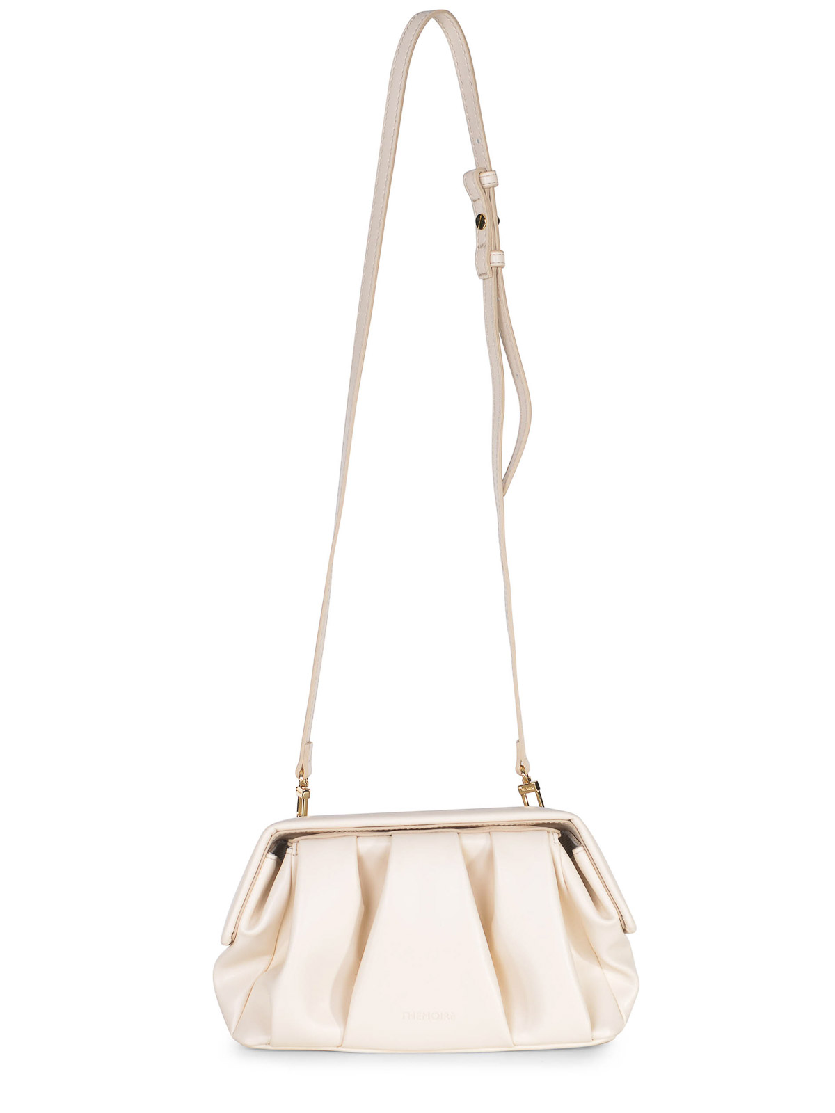 クリーム色のフェイクレザー製のThemoir アフロディーテバッグ。リサイクルされた環境に優しい素材で作られています。ゴールドメタル仕上げ。フリルのディテール。内部マグネットクロージャー。裏地付き、オーガニックコットン。調節可能で取り外し可能なショルダーストラップ。高さ:13 cm 幅:26 cm 奥行:7 cm 100% PU イタリア製
