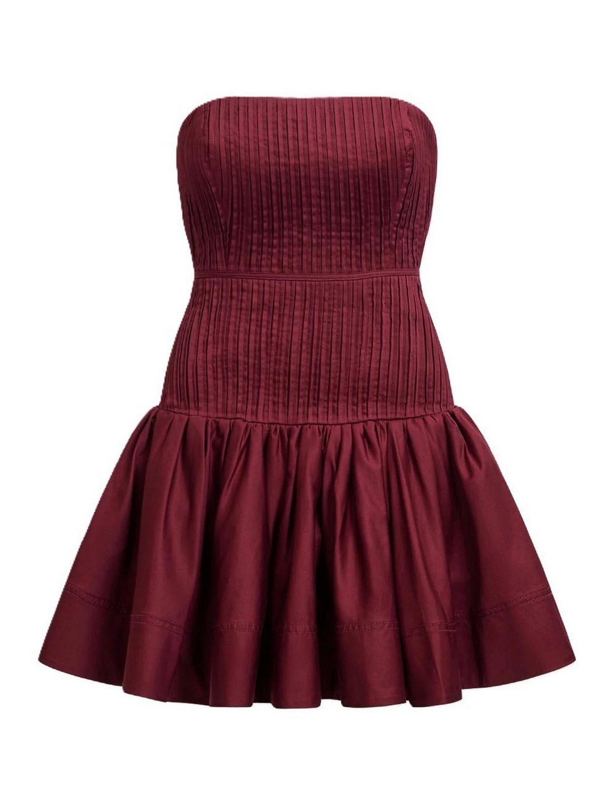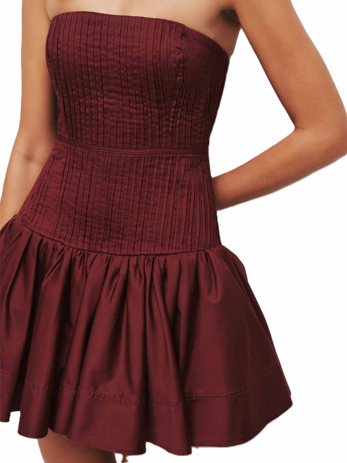 ストラップレスミニドレスストレートネックラインストラクチャードボディスボディスボディスボディスボディスボディスボディスは、ボディス全体に細かな縦フリルが付いており、ウエストシームがはっきりしています。タックとギャザー付きのフルスカートはタックとギャザー付きで、彫刻的な引き手の裏地が付いたジッパー付き英国サイズ