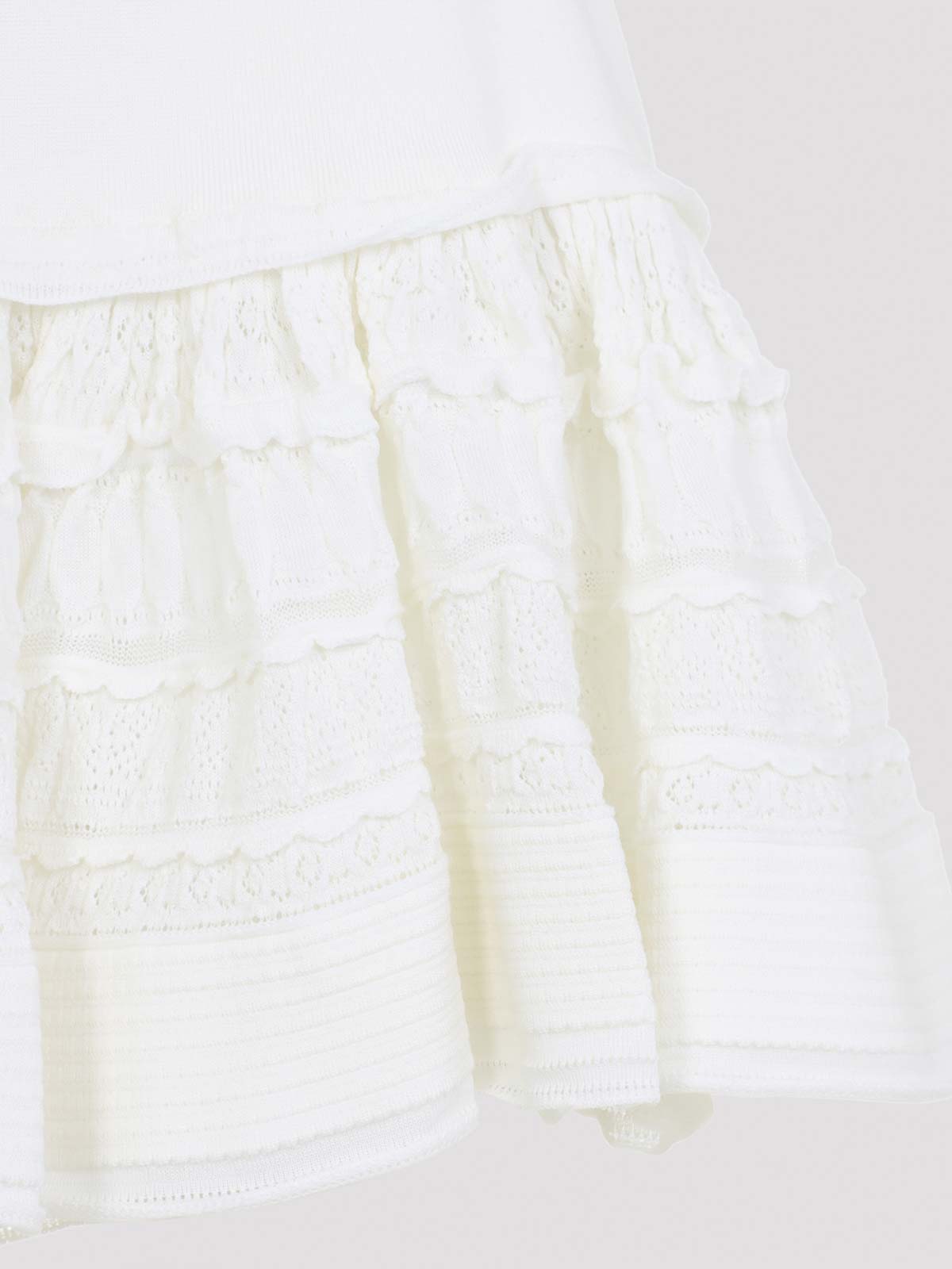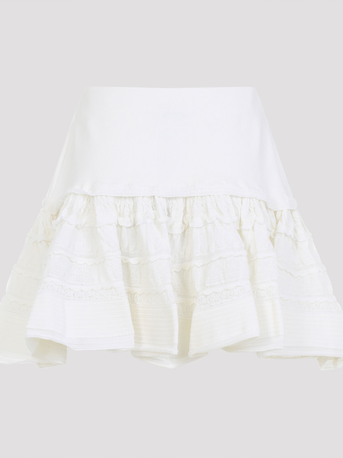 Alaa フリルのホワイトウールミニスカート。ホワイトウール製で、ローウエスト、フィット感のあるウエストバンド、裾にポインテルパネルをあしらったボリュームのあるデザイン、総裏地付きの隠しファスナーが特徴です。