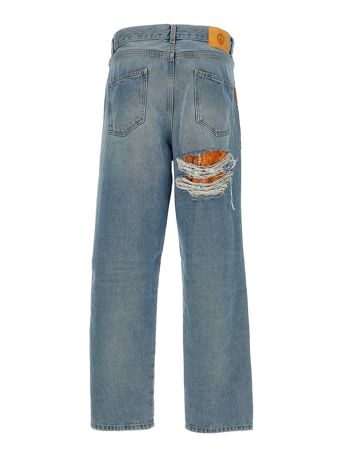 裂け目とバンダナインサート、ストレートレッグ、ジッパーとボタン留めが特徴のカリフォルニアデニムジーンズ
