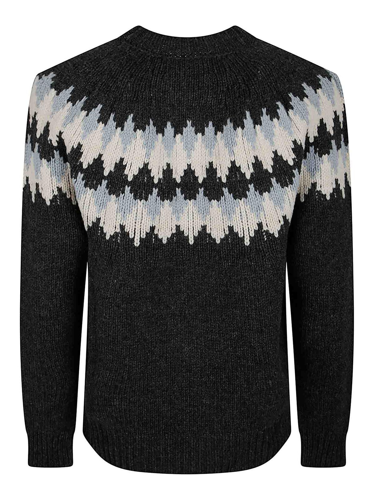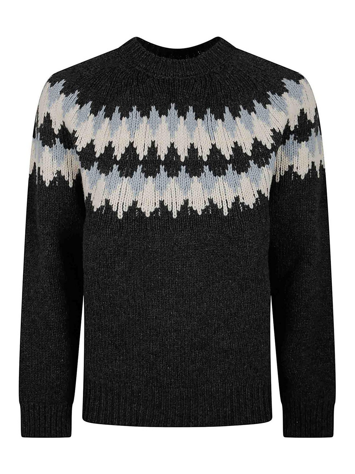 Alanuiのバージンウールで仕立てたキュートな冬用セーター。クルーネック、ロングスリーブ。クラシックなノルディックスタイルで、ジャカードニットにフェアアイル柄を再解釈しました。