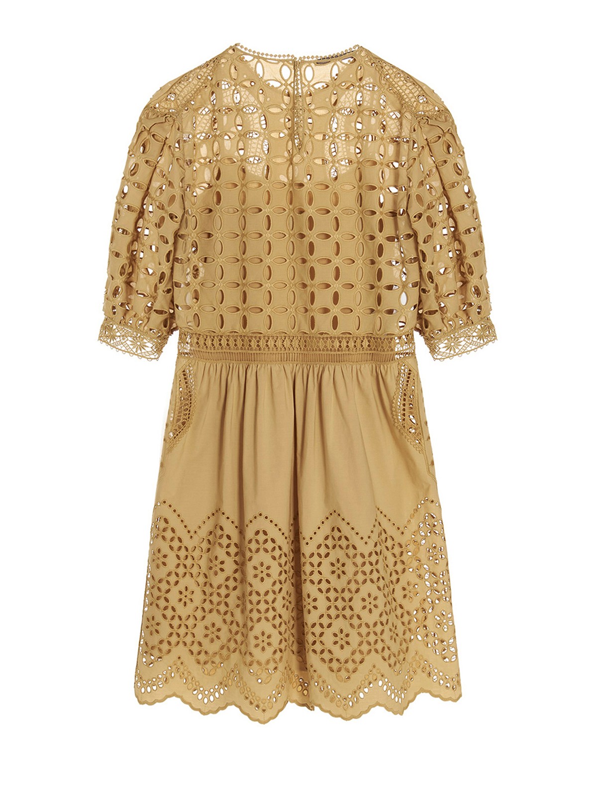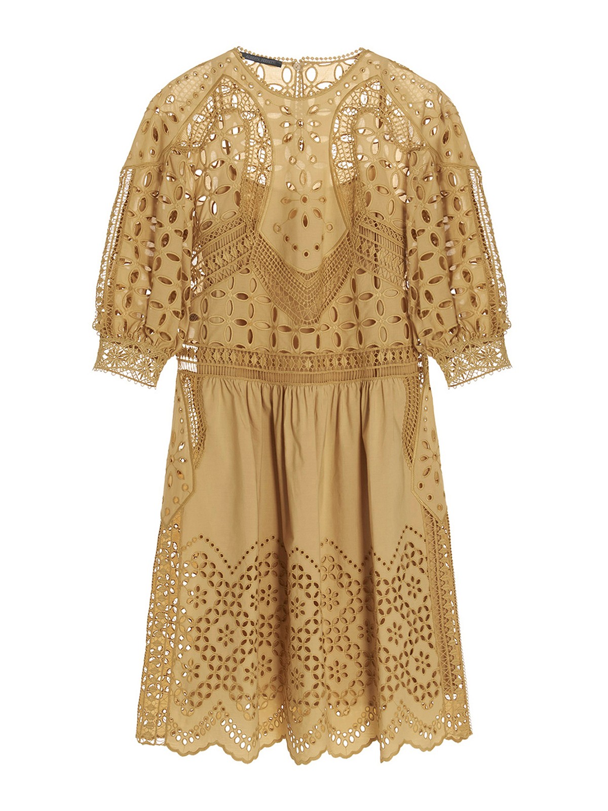 レーススリーブ、シアーディテール、七分袖、クルーネックの刺繍入りアングレーズドレス