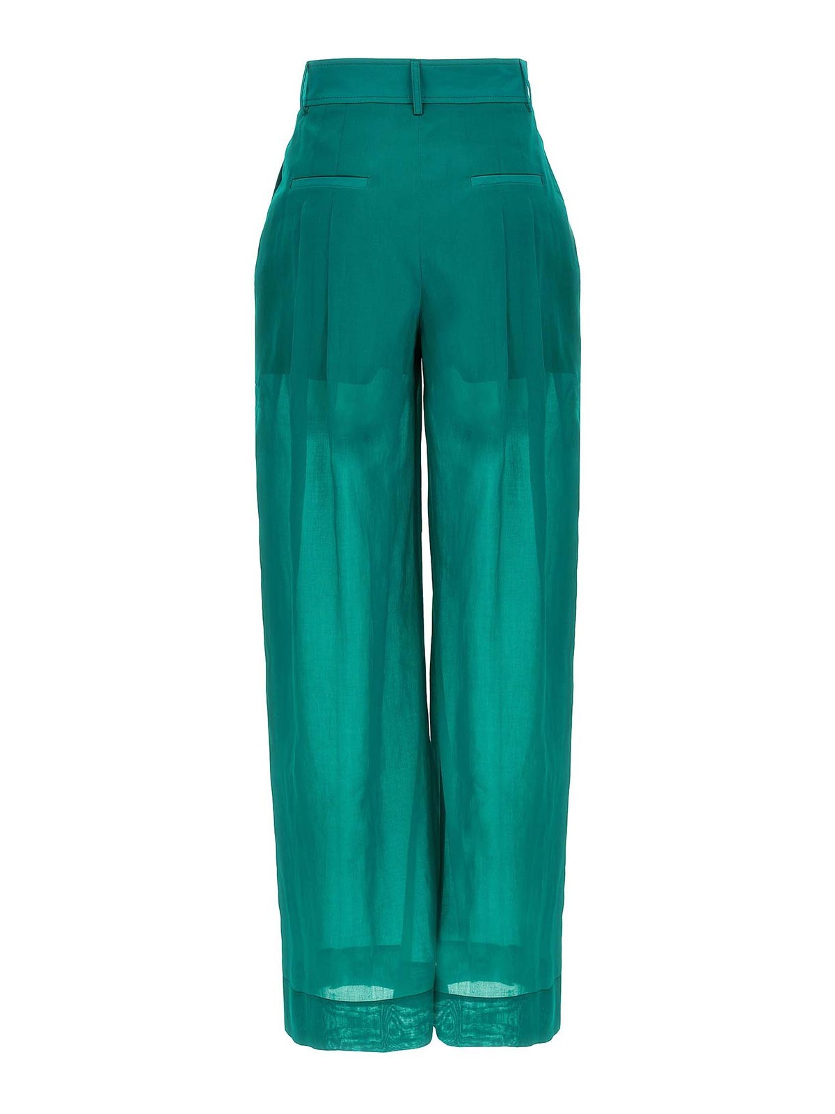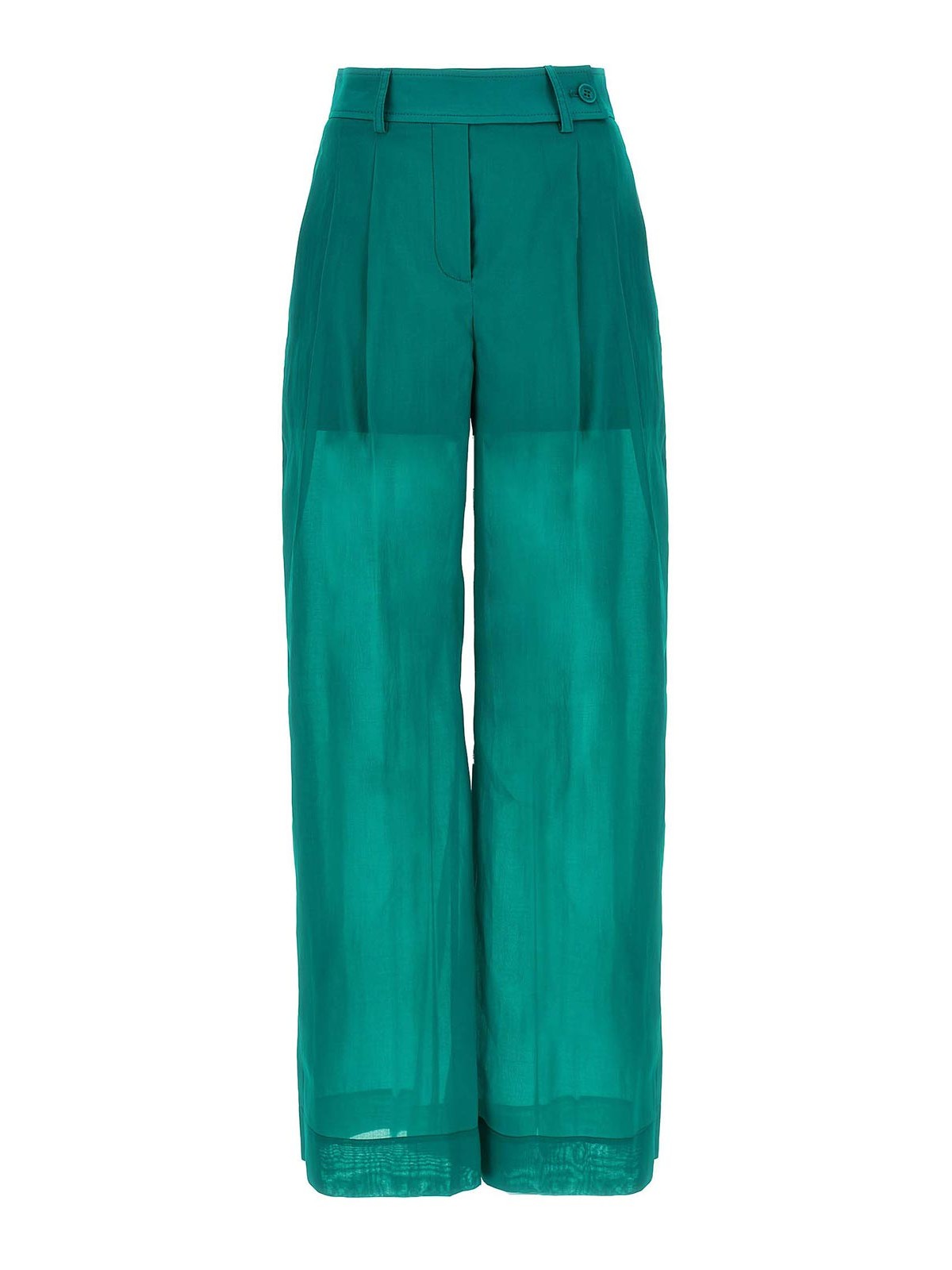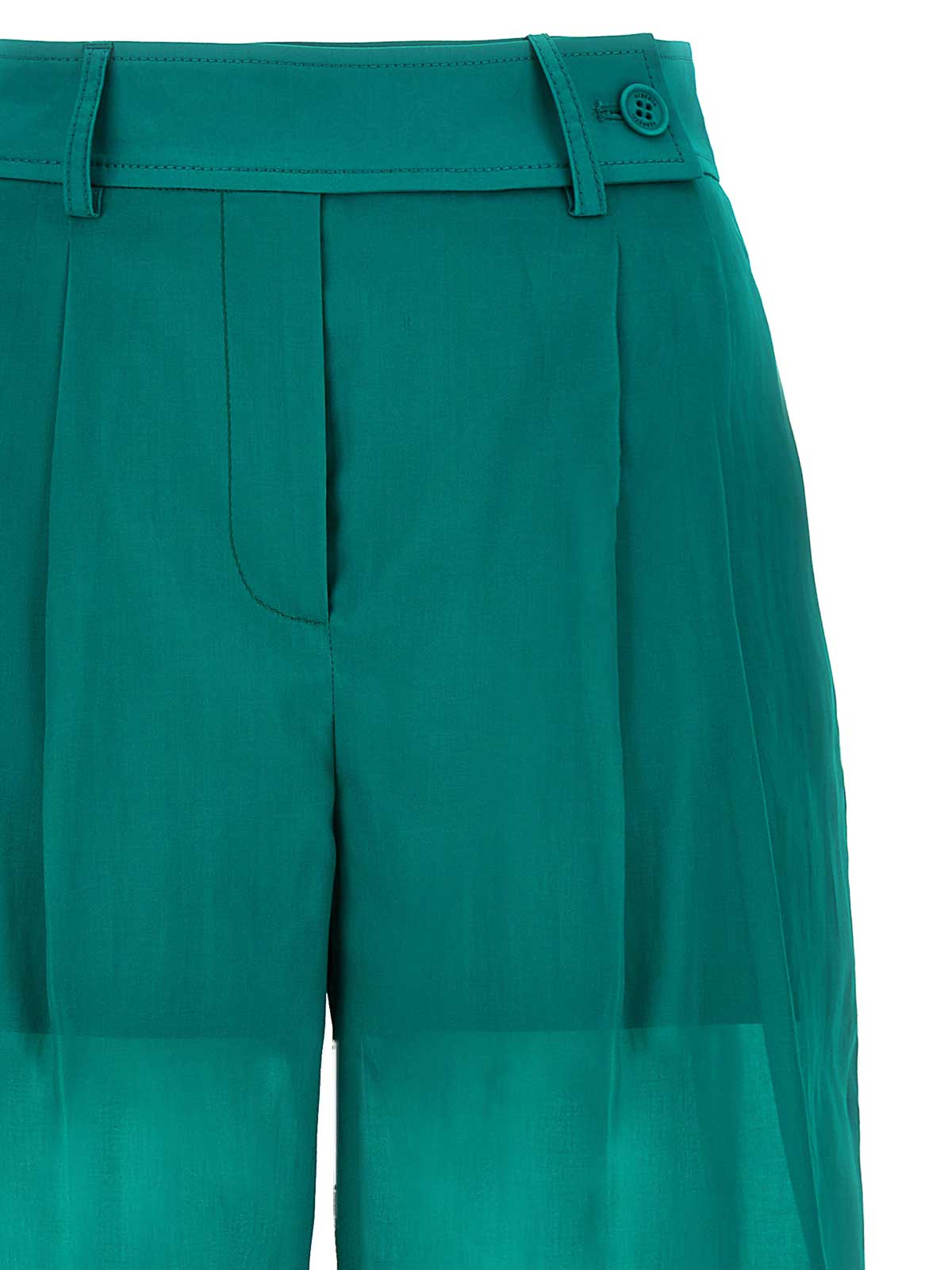 セミ透明オーガンザのモスリンプリーツが入ったハイウエストパンツ。ファスナーとボタン付きのワイドレッグポケット